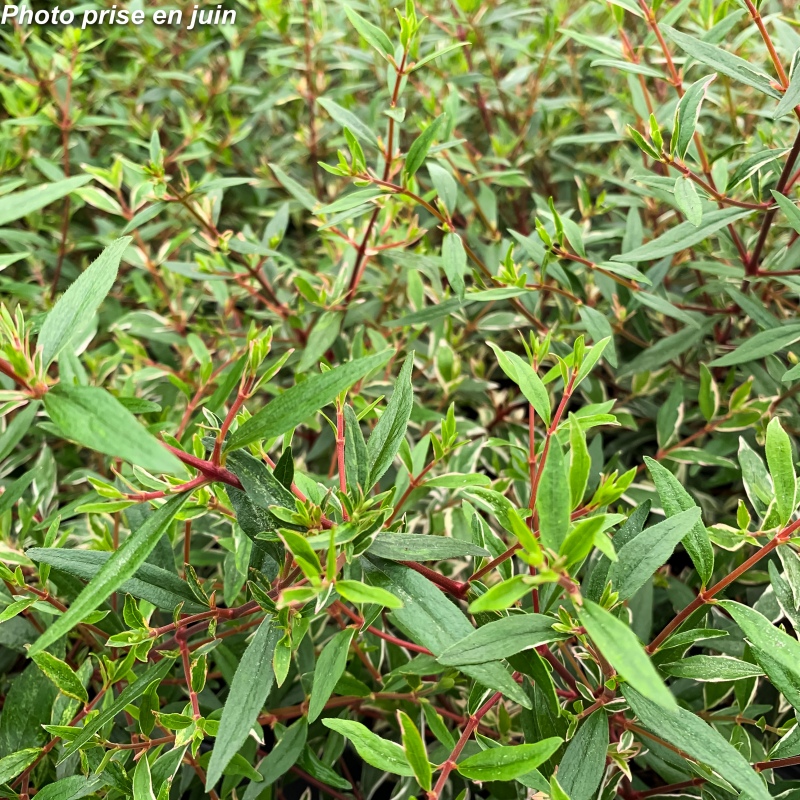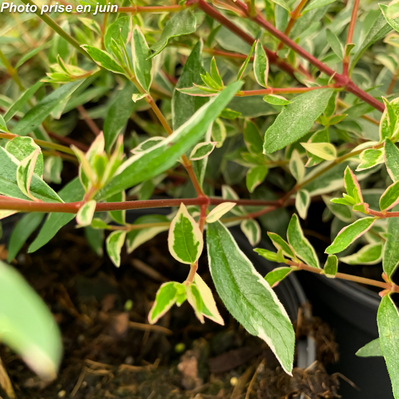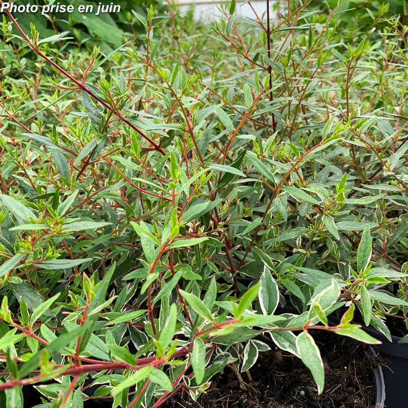 Arbuste semi-persistant. Feuillage vert marginé de blanc. Floraison blanc rosé en été. Port compact en boule. Exposition: soleil, mi-ombre. Sol sain bien drainé. 0. 60 m x 0. 50 m. Rusticité: -7°C.
