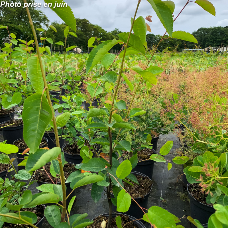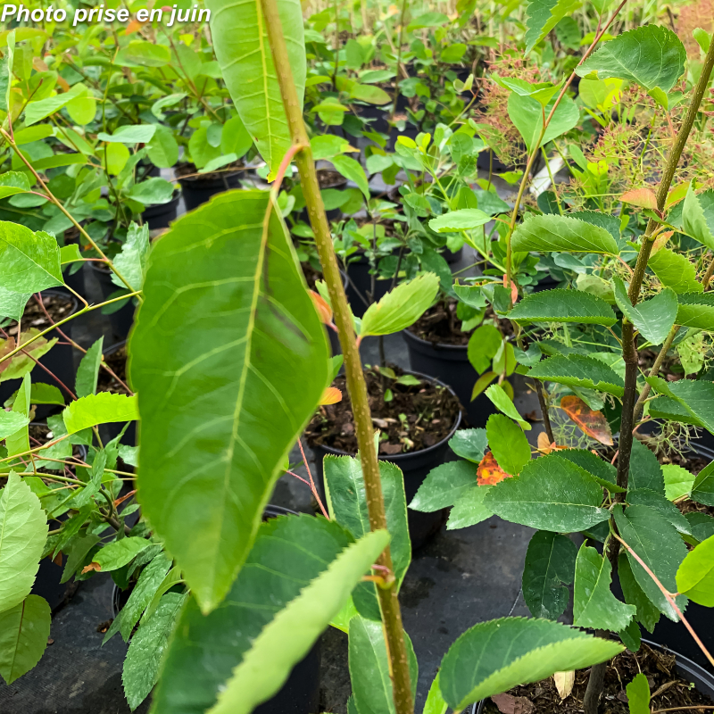 Une floraison abondante et féérique ! Les jeunes feuilles bronzes de ce petit arbre ou arbuste caduc, très ramifié, passent au vert sombre en été, puis au rouge-orangé à l'automne. Les grappes pendantes de fleurs blanches sont suivies de fruits sucrés et juteux, violet foncé. Floraison en avril-mai. Sol sain, humifère, frais. Port dressé : 5 m x 2 m Rusticité : - 15°C