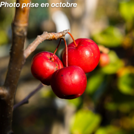 Petit arbre. Port dressé, évasé. Feuilles vertes. Fleurs blanches en avril- mai. Fruits comestibles rouges en fin d'été persistants jusqu'en décembre, très convoités par les oiseaux. Soleil ou mi-ombre. Sol ordinaire. H: 5 m x 3 m. Rusticité: -20°C. Nom commun: Pommier fleur, pommier du japon.