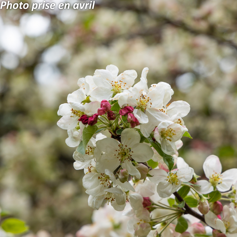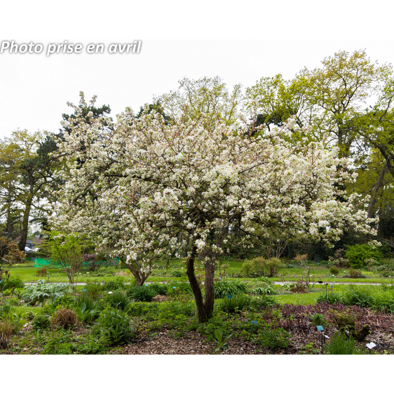 Petit arbre appelé aussi pommier fleur ou pommier du Japon. Port dressé, plus étalé en vieillissant. Feuilles vertes. Fleurs blanches, roses en boutons s'épanouissant en avril. Fruits orangés comestibles en fin d'été persistants jusqu'en hiver, très convoités par les oiseaux. Soleil ou mi-ombre. Sol ordinaire. Port étalé. H: 4 m x 3 m. Rusticité: - 20°C.