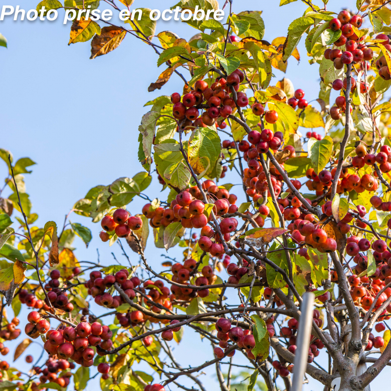 Le Malus Evereste est un arbre fruitier d’ornement à la floraison abondante. Il s’agit d’un pommier hybride obtenu par un croisement entre le Malus pumila ‘Rome Beauty’ et le Malus Floribunda. Au printemps, il se couvre de magnifiques boutons roses, suivis de jolies fleurs blanches. En automne, à la place des fleurs, ses branches se chargent de belles pommes rouge orangé de la taille des cerises, d’environ 2,5 cm de diamètre.