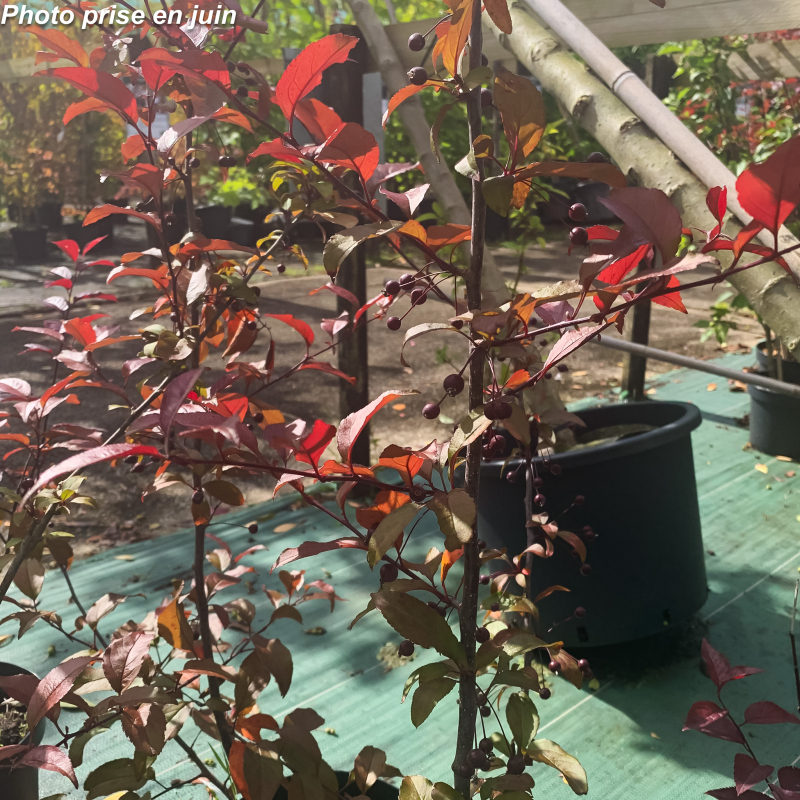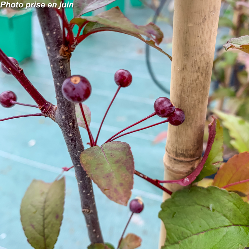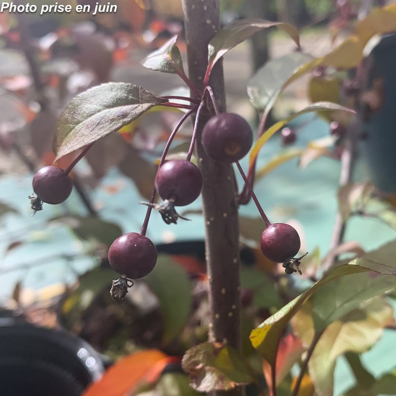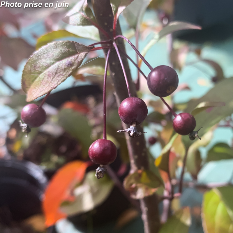 Petit arbre. Port dressé, évasé. Feuilles vert pourpre. Fleurs de couleur rose-rouge en mai. Fruits non comestibles rouge foncé vif, persistants jusqu'en décembre, très convoités par les oiseaux. Soleil ou mi-ombre. Sol ordinaire. H: 6 m x 4 m. Rusticité: -20°C.