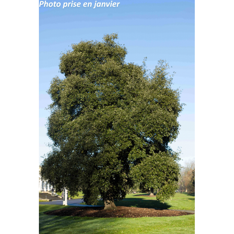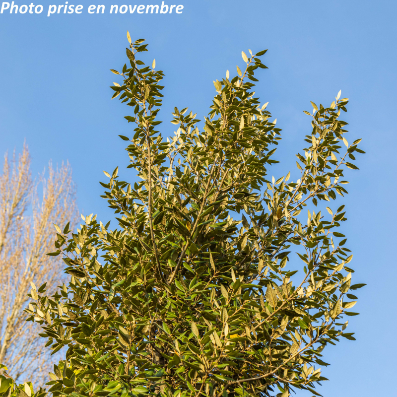 Arbre persistant de taille moyenne au feuillage rappelant le houx, vert glauque au revers grisâtre, écorce noire et petits glands à cupule presque lisse. Soleil mi-ombre ou ombre. Sol ordinaire plutôt sec. Port arrondi: 8 m x 6 m. Rusticité: - 15°C. Nom commun: Chêne vert.