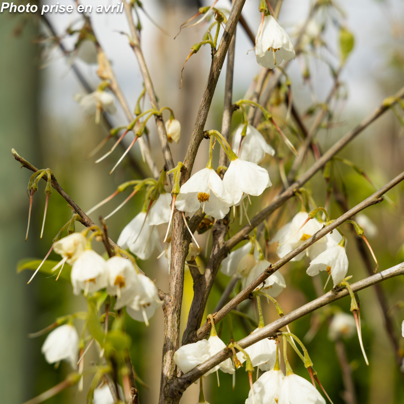 Arbre caduc produisant de nombreux bouquets de fleurs blanches en clochette pendantes, juste avant l'apparition de feuilles. Ses feuilles prennent de belles couleurs jaunes en automne. Apprécié aussi pour ses curieux fruits ailés, vert. Floraison : mai à juin. Exposition : soleil ou mi- ombre. Sol léger, humifère, sans trop de calcaire, frais. Port ouvert : 8 m x 6 m. Rusticité : - 15°C