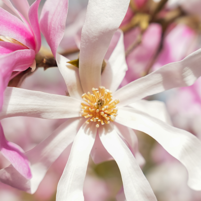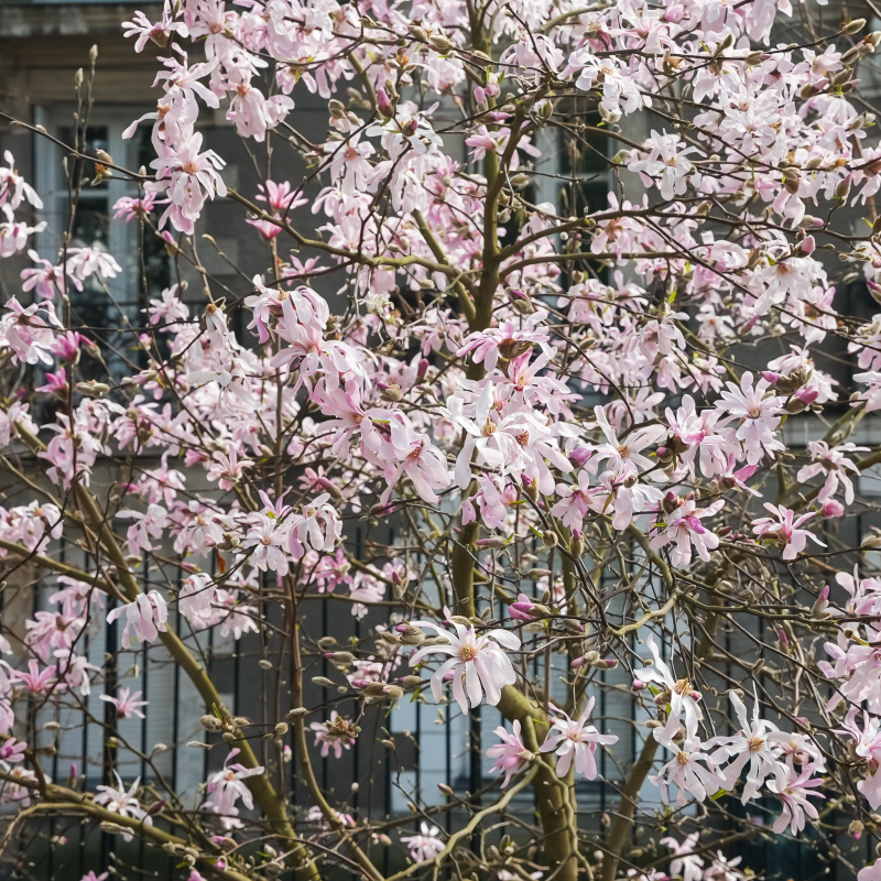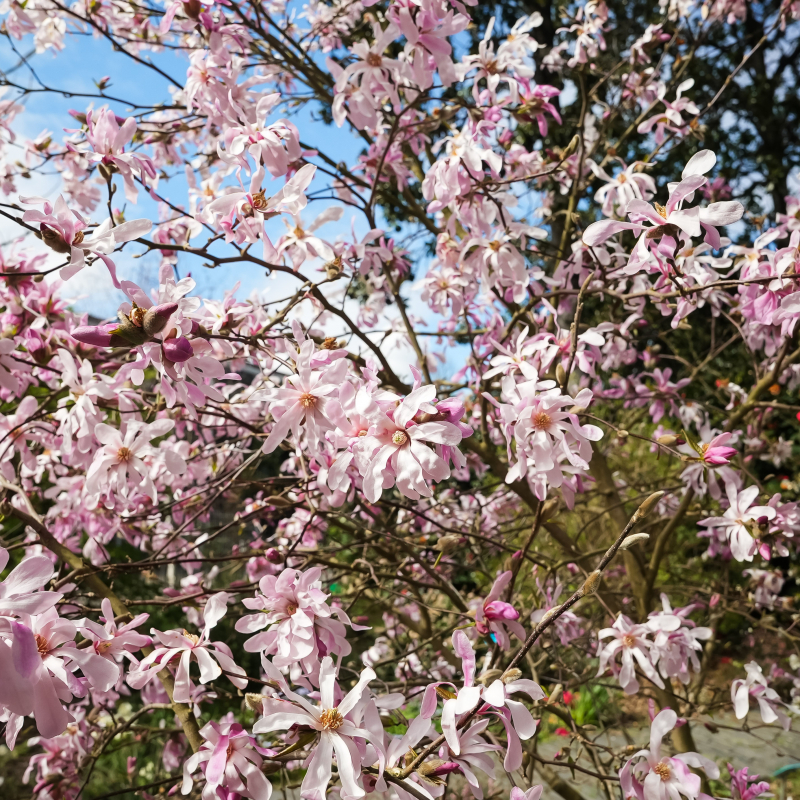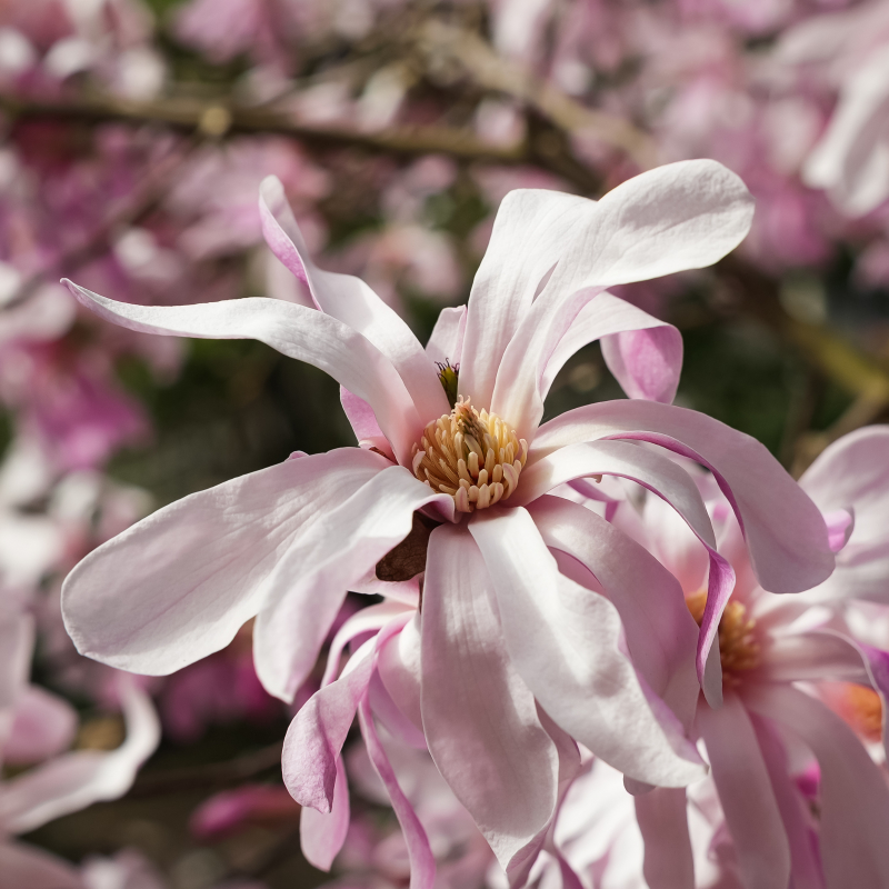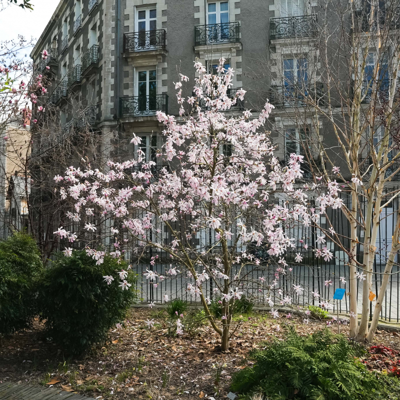 Le Magnolia 'Leonard Messel' est une variété hybride remarquable, issue du croisement entre le Magnolia kobus et le Magnolia stellata. Il se distingue par sa floraison abondante et précoce, qui illumine le jardin dès le début du printemps.