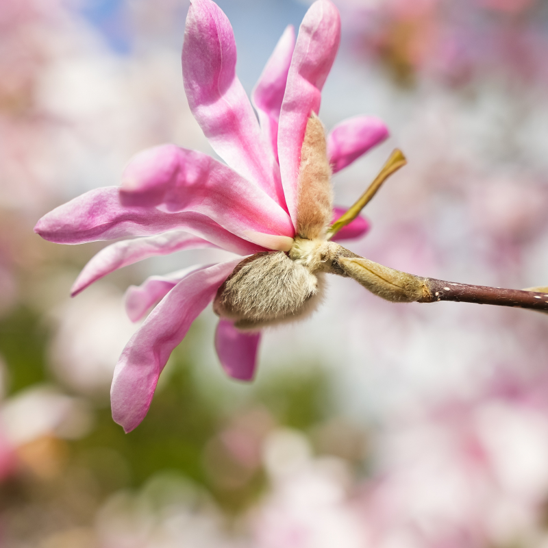 Le Magnolia 'Leonard Messel' présente un port élégant et étalé, pouvant atteindre 4 à 6 mètres de hauteur. Ses feuilles caduques, vertes et légèrement brillantes, offrent un beau contraste avec ses fleurs en étoile, d'un rose violacé lumineux au revers plus foncé.