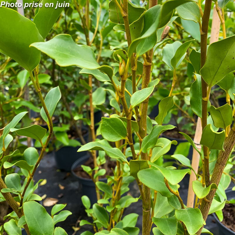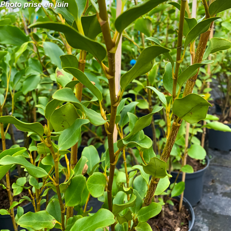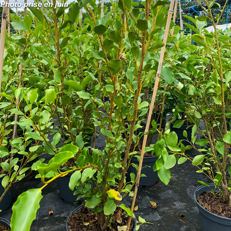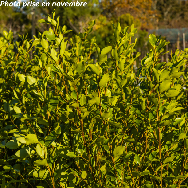 Arbuste persistant à feuillage coriace et brillant vert pomme clair, très lumineux. Floraison vert-jaune insignifiante en fin de printemps. Port compact et dense. Il saura apportera de la lumière à vos haies moyennes et hautes. Soleil. Sol sain à sec. Ne souffre pas réellement du manque d'arrosage. 5 m x 2 m. Rusticité: - 12°C.