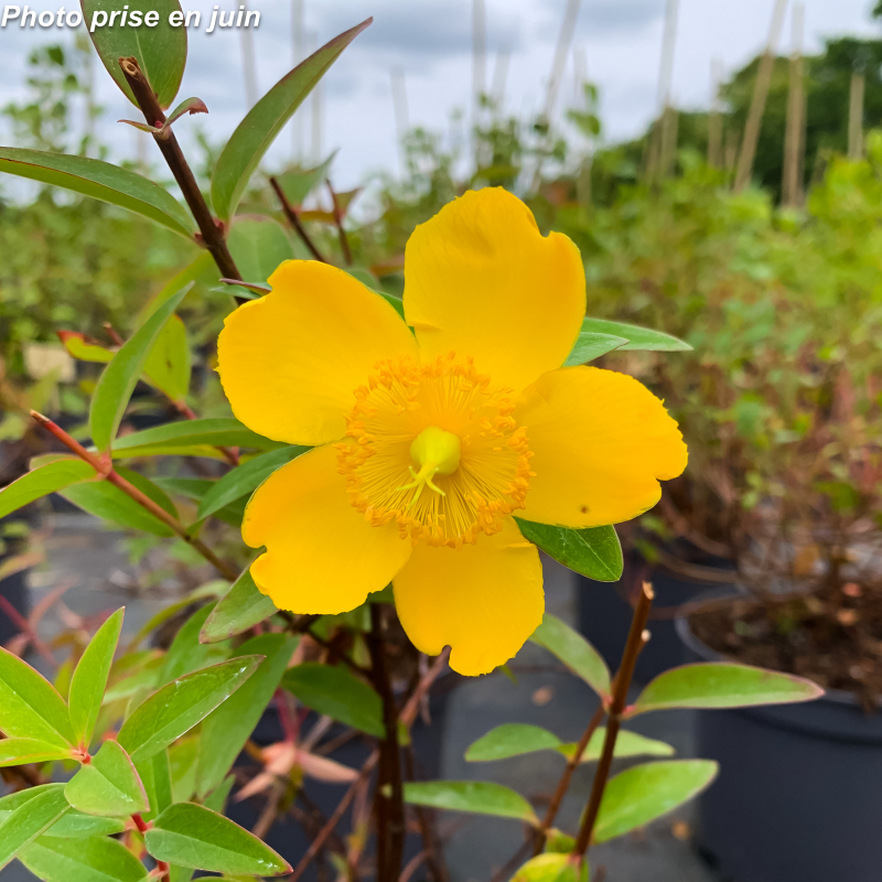Arbuste semi-persistant au feuillage vert aux fleurs simples jaunes ouvertes de 7 à 9 cm de juillet à octobre. Soleil ou mi-ombre, floraison moins abondante à l'ombre. Sol ordinaire frais ou sec, bien drainé. Port arrondi: 1,50 m x 1 m. Rusticité: -20°C. Nom commun: Millepertuis arbuste.
