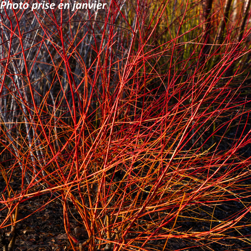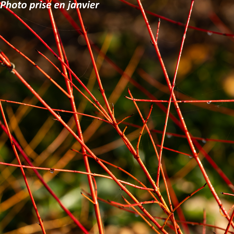 Une écorce flamboyante en plein hiver!Arbre de petit développement au port érigé, au feuillage caduc vert clair, devenant jaune à l'automne. Floraison de couleur blanc peu intéressante au printemps. Apparition de fruits décoratifs de couleur noir au début de l'automne. Ses rameaux colorés sont très décoratifs couleur orange rouge en hiver. Soleil. Sol ordinaire et acide. 2. 50 m x 1. 20 m Rusticité: -15°C