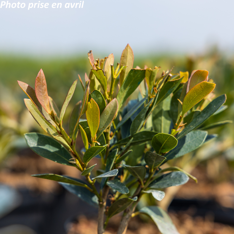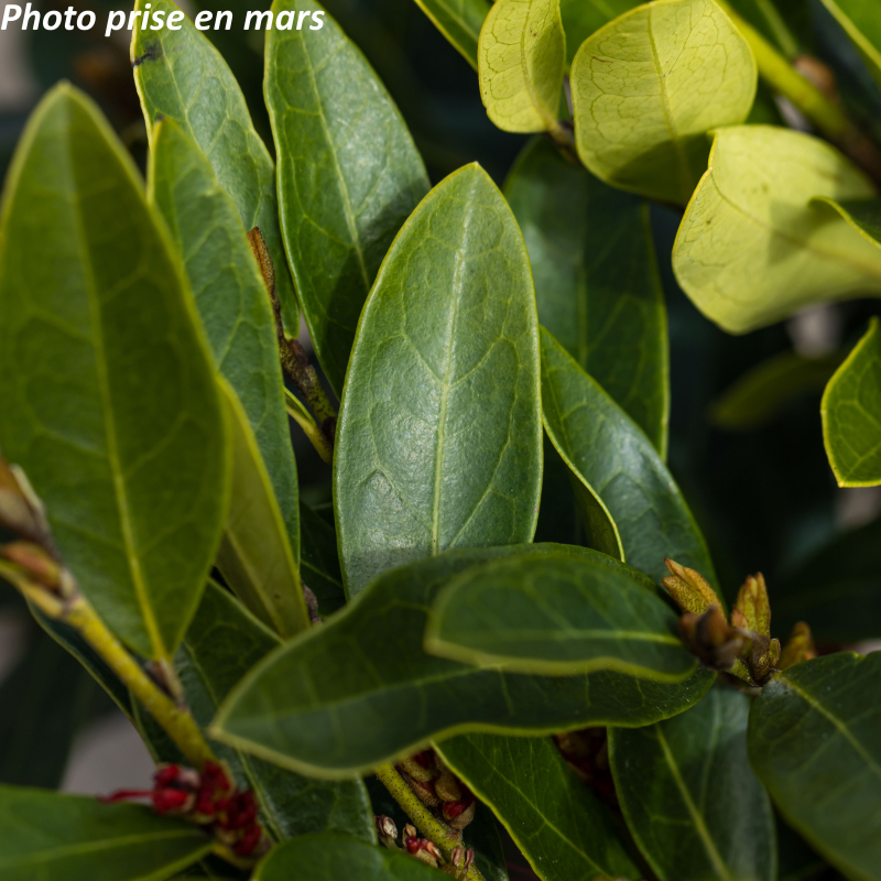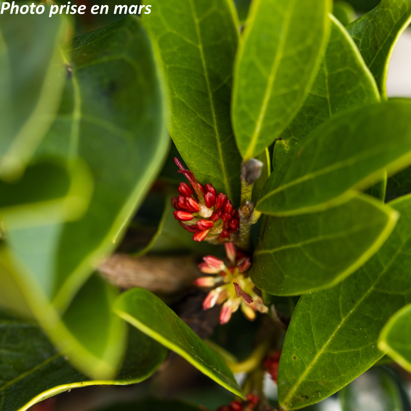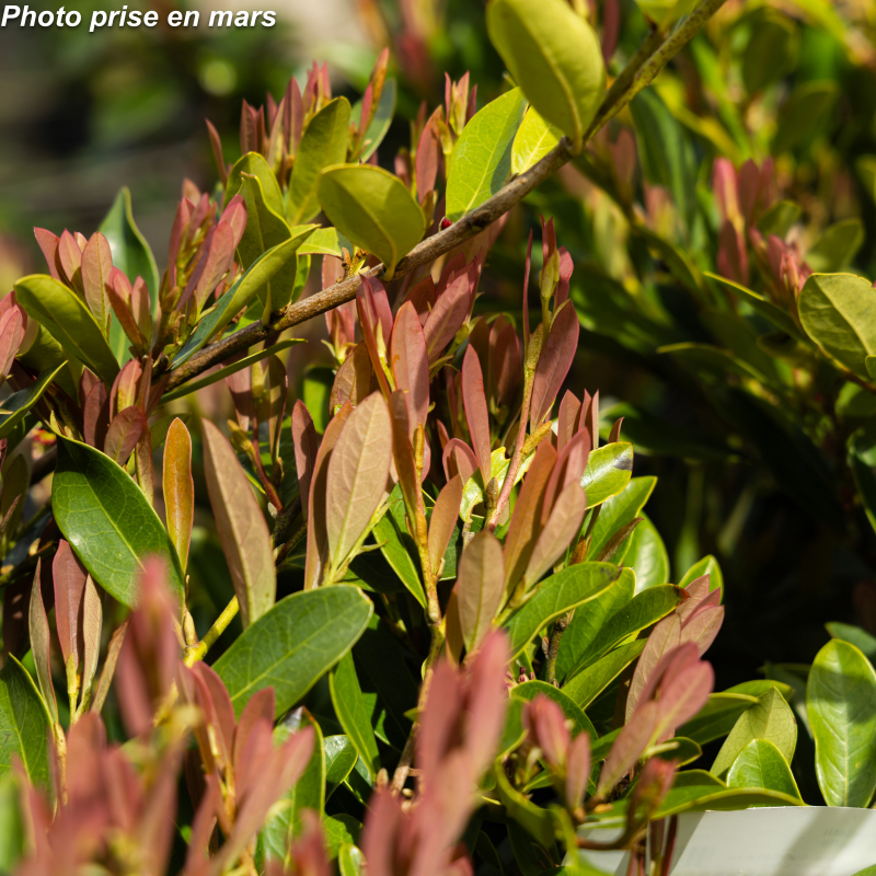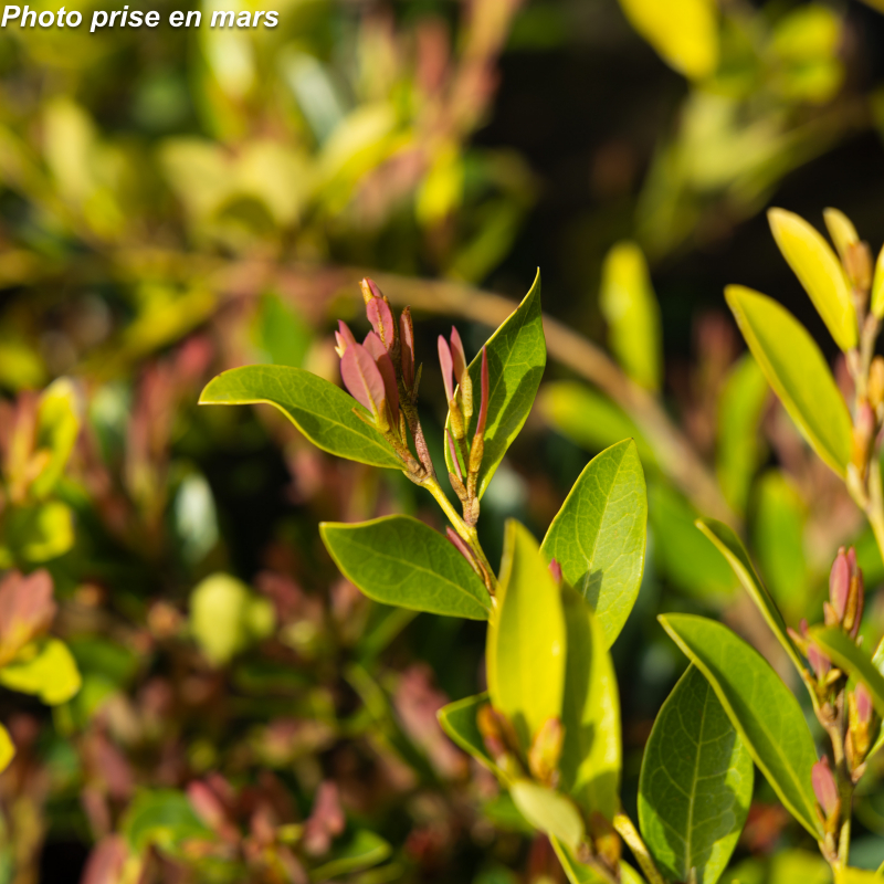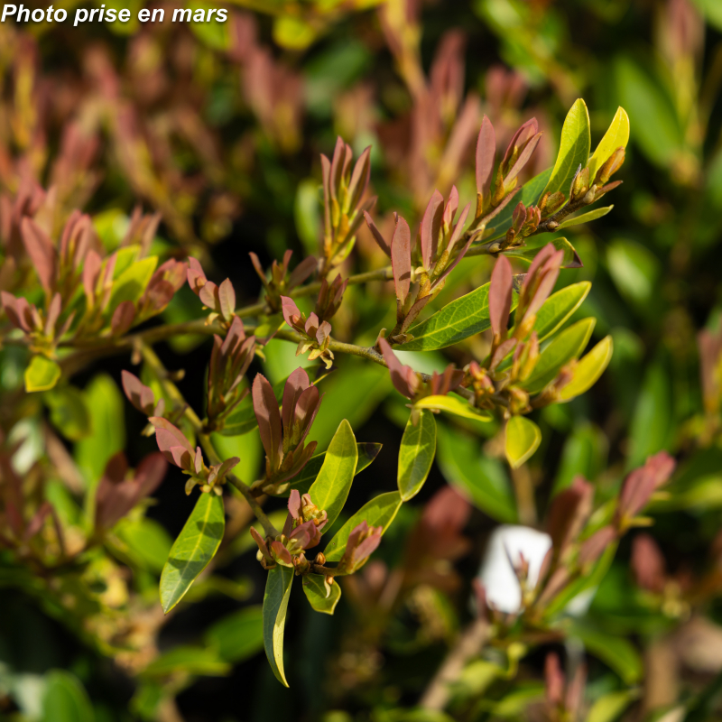 Joli petit arbuste à la floraison rouge foncé très esthétique en mars-avril. Feuillage persistant oblongue vert foncé bleuté aux reflets pourpres. Ne craint pas la sécheresse, peut tolérer des sols humides. Soleil à mi-ombre Port large: 1. 30 m x 1. 60 m Rusticité: -15°C.