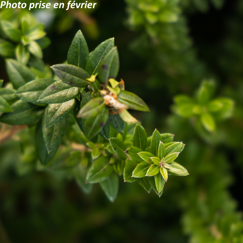 Arbuste persistant large avec une végétation aromatique compacte. Ses petites feuilles lancéolées coriaces, brillantes sont d'un beau vert lumineux. En été, ses petites fleurs parfumées et mellifères sont crème nuancé de rose. Apparaissent ensuite de petites baies blanc noirâtre qui décorent joliment les branches et sont appréciées des oiseaux. Floraison : juin-juillet. Exposition : soleil, mi-ombre. Tolère très bien les embruns et la sécheresse. Sol ordinaire, sain. Port érigé arrondi : 1 x 1,80 m. Rusticité : - 10°C