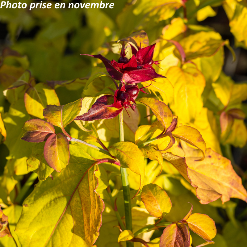Arbuste semi-persistant aux tiges bambusiformes et au feuillage doré décoratif. Feuilles cordiformes, à la pointe fine et allongée, intéressant à l'automne. Inflorescences à l'architecture étonnante en bouquets pendants aux bractées rouge pourpre se superposent des fleurs tubulaires ivoire. De petites baies apparaissent couleur vieux rose puis prune (très appréciées des oiseaux). Floraison d'août à octobre. Exposition : soleil, mi-ombre. Sol ordinaire, sain. Port buissonnant : 2m x 1,50 m. Rusticité : - 15°C.