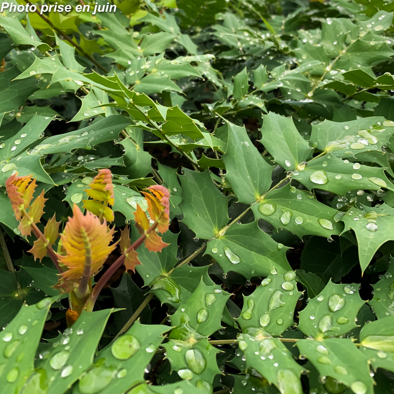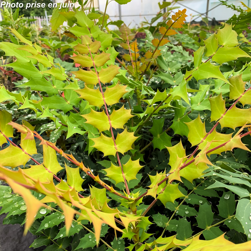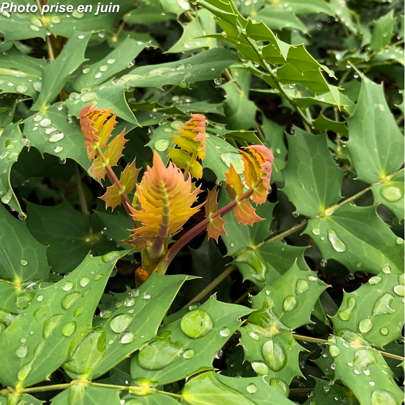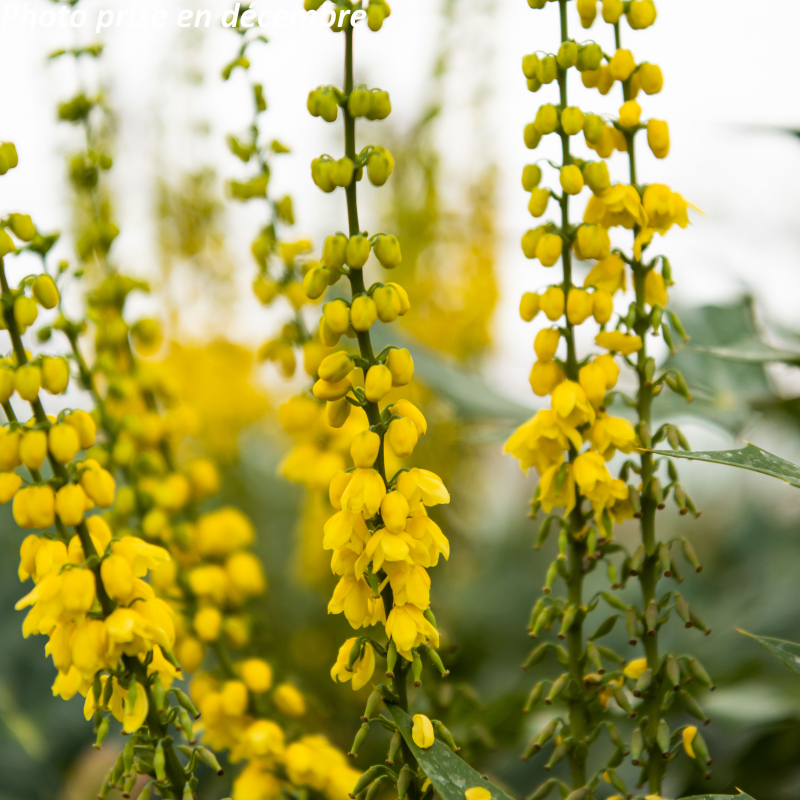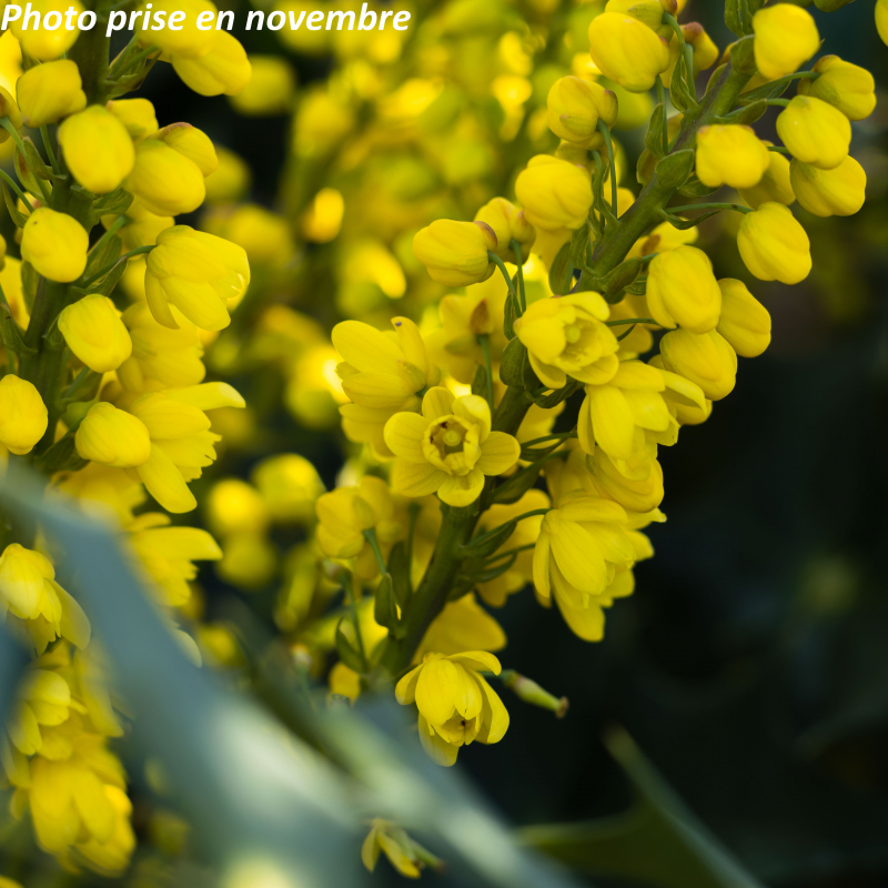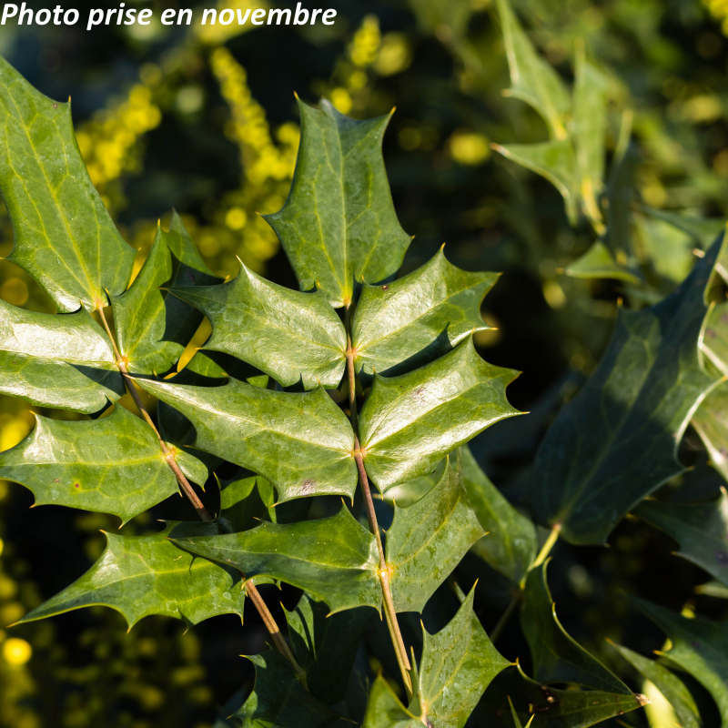 Arbuste persistant au feuillage vert brillant rappelant le houx, fleurs jaunes en grappes dressées réunies en bouquets à partir de Décembre. Méllifère. Ombre ou mi-ombre. Sol ordinaire frais humifère. Port dressé: 1,80 m x 1,80 m. Rusticité: -15°C.