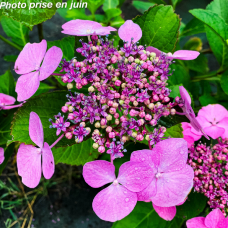 Hortensia à fleurs plates, de couleur allant du mauve au bleu .