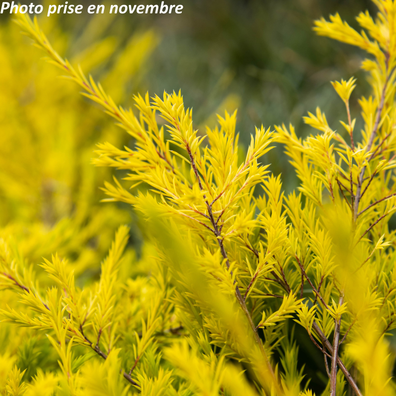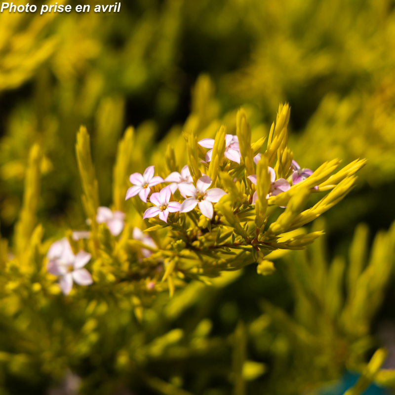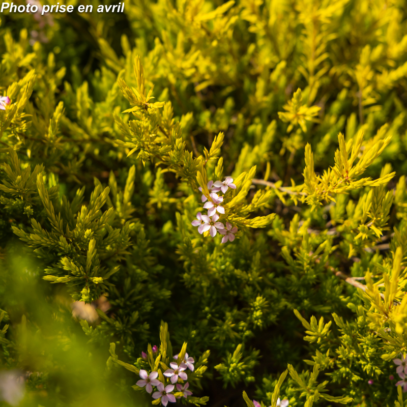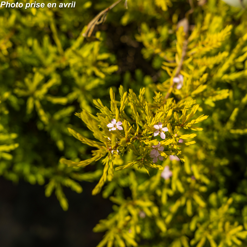 Le Diosma hirsuta 'Sunset Gold' est un arbuste de petite taille qui forme un coussin dense couvert de petites fleurs étoilées. Il se distingue grâce à son feuillage de couleur dorée évoquant la bruyère. Il est originaire d’Afrique du Sud et largement cultivé en Asie et en Australie. Aussi, les climats secs ne lui font pas peur.