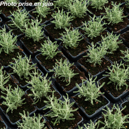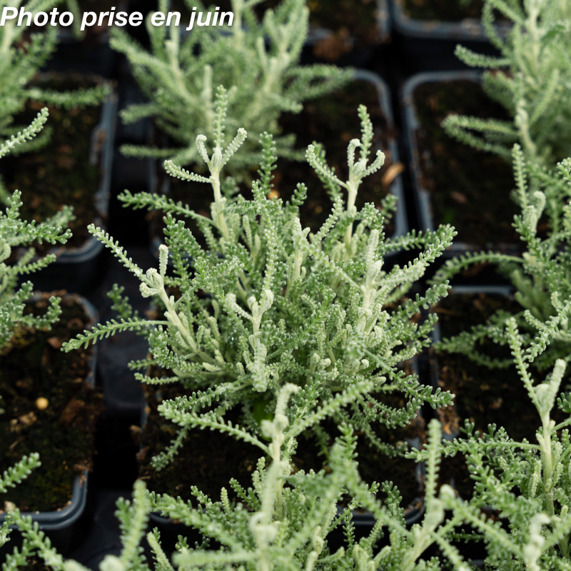 Vivace persistante au feuillage gris fin aromatique et aux fleurs réduites à une boule d'étamines jaunes en juin juillet. Soleil. Sol ordinaire bien drainé à sec. Port en boule : 0.40 m x 0.40 m. Rusticité : -12°