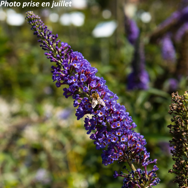 Le plus : le paradis des papillons ! Arbuste caduc à longues feuilles lancéolées, vert foncé, à revers blanchâtre. Les fleurs forment de longs épis effilés bleu violacé, oeil orangé en été et attirent les papillons. Port dressé, évasé. Soleil, mi ombre. Sol sain. 2. 50 m x 2. 50 m. Rusticité: -15°C.