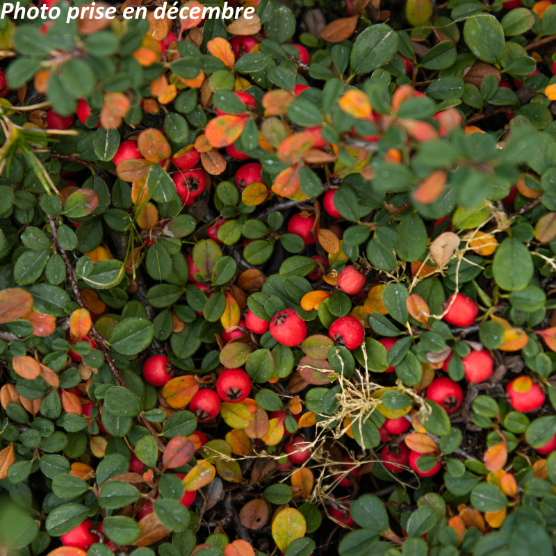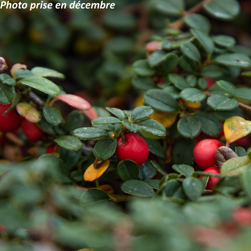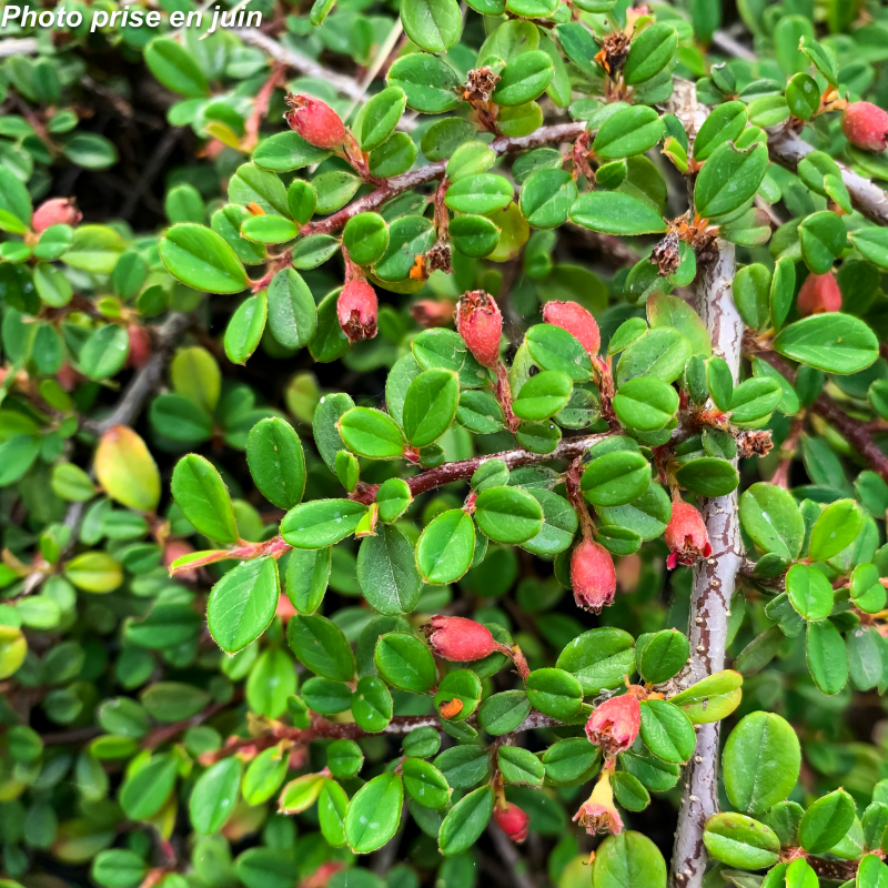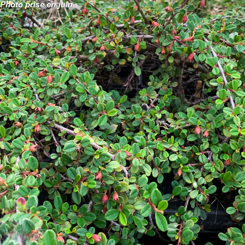 Arbuste persistant nain très rampant ou retombant, aux minuscules feuilles vertes parsemées de fleurs blanches en mai-juin, suivies en automne de petites boules rouges. Les branches épousent parfaitement le support. Soleil ou mi-ombre. Sol ordinaire. Port étalé: 0,15 m x 1 m. Rusticité: - 15°C. Nom commun: Cotoneaster rampant.
