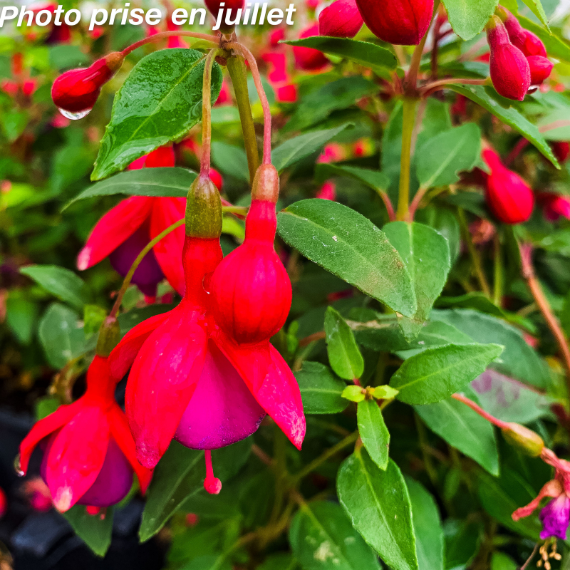 Magnifique vivace au feuillage caduc vert moyen luisant. Floraison très caractéristique rouge carmin et violet. aux étamines très visibles. non parfumée en juin. juillet. Variété naine de fuchsia. Elle agrémentera vos massifs pendant toute l'été avec sa floraison très esthétique. Croissance rapide.