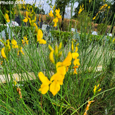 Arbuste persistant aux petites feuilles éparses le long de rameaux junciformes verts aux fleurs odorantes jaunes de juillet à septembre. Soleil. Sol sain à sec. Port dressé évasé en vieillissant : 3 m x 1 m. Rusticité: - 12°C