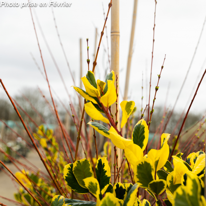 Houx compact, vigoureux, à feuilles persistantes luisantes vert foncé, marbrées de gris-vert au centre, largement marginées d'or vif. Floraison très discrète en avril-mai, mellifère. Sujet femelle ne produisant que peu de baies rouges en hiver. Soleil ou mi-ombre. Sol ordinaire, pas trop sec à frais. Port dressé compact : 6 m x 4 m. Rusticité : - 15°C