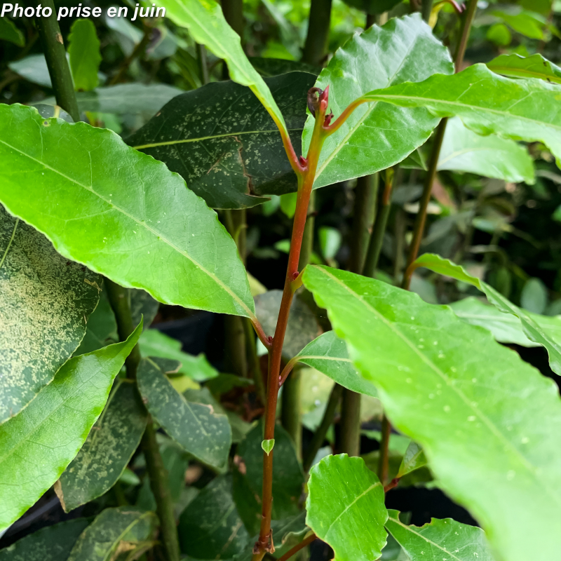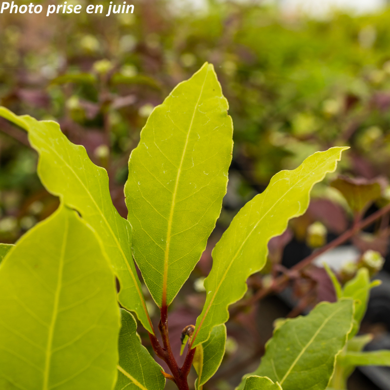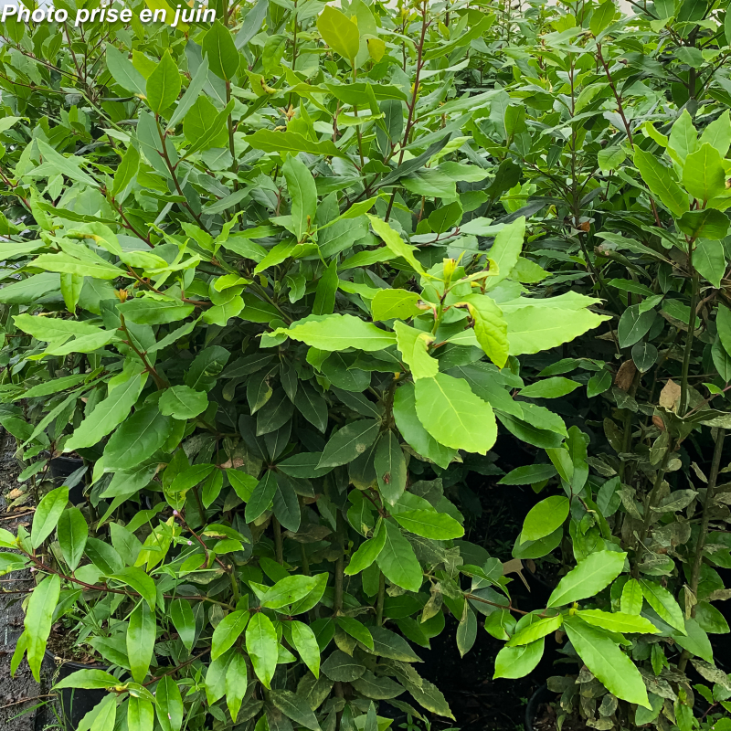 Arbuste persistant au feuillage vert foncé aromatique aux fleurs minuscules jaune clair odorantes en avril suivies de fruits noirs recherchés par les oiseaux. Soleil, mi-ombre ou ombre. Sol ordinaire à sec. Port vertical: 3 à 4 m x 1,50 m. Rusticité: -15°C. Nom commun: Laurier sauce, laurier d'Apollon.