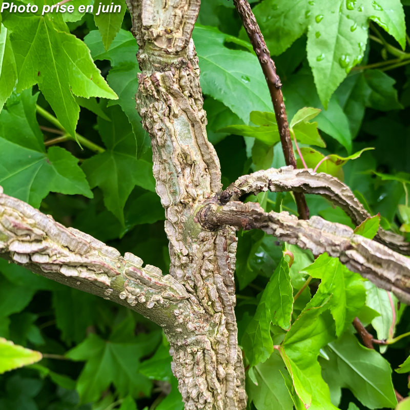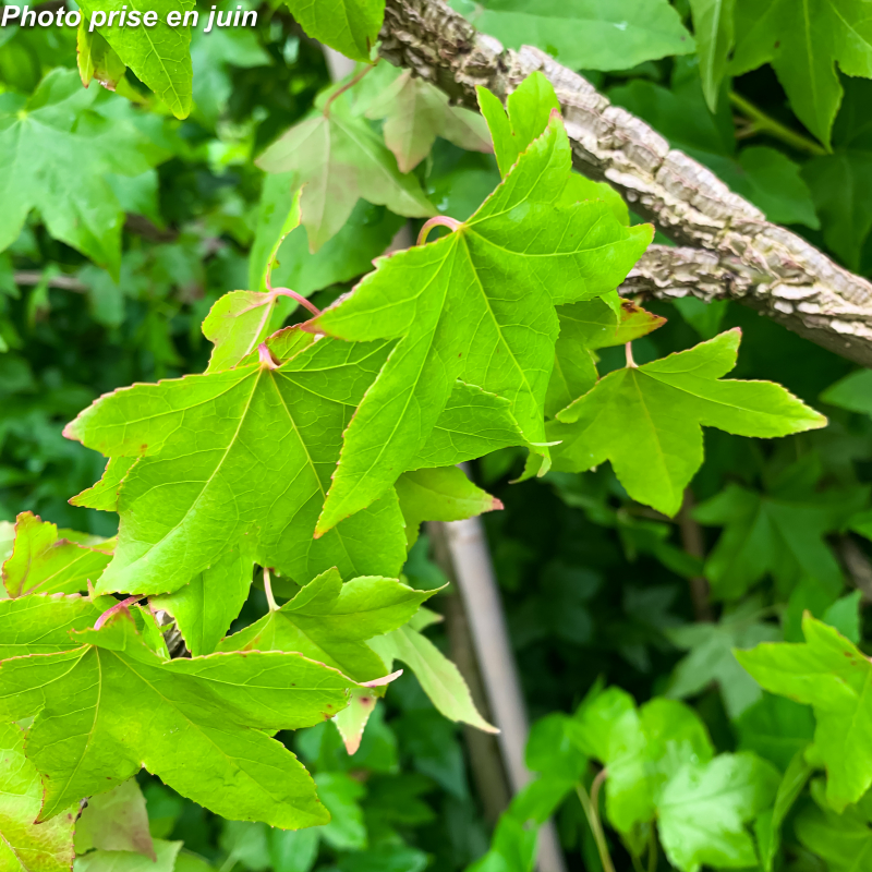 Arbre caduc de taille moyenne au feuillage palmé 5 à 7 lobes vert foncé virant en couleurs flamboyantes en automne du violet pourpre au rouge orangé et jaune. Ecorce liègeuse sur le tronc et les branches principales très décorative en hiver. Les branches basses peuvent être conservées ou coupées pour libérer le tronc. Fleurs insignifiantes en mai suivies de capsules rondes hérissées persistant en hiver. Soleil ou mi-ombre. Sol ordinaire à frais. Port pyramidal : 6 m x 4 m en 20 ans. Rusticité: - 15°C.