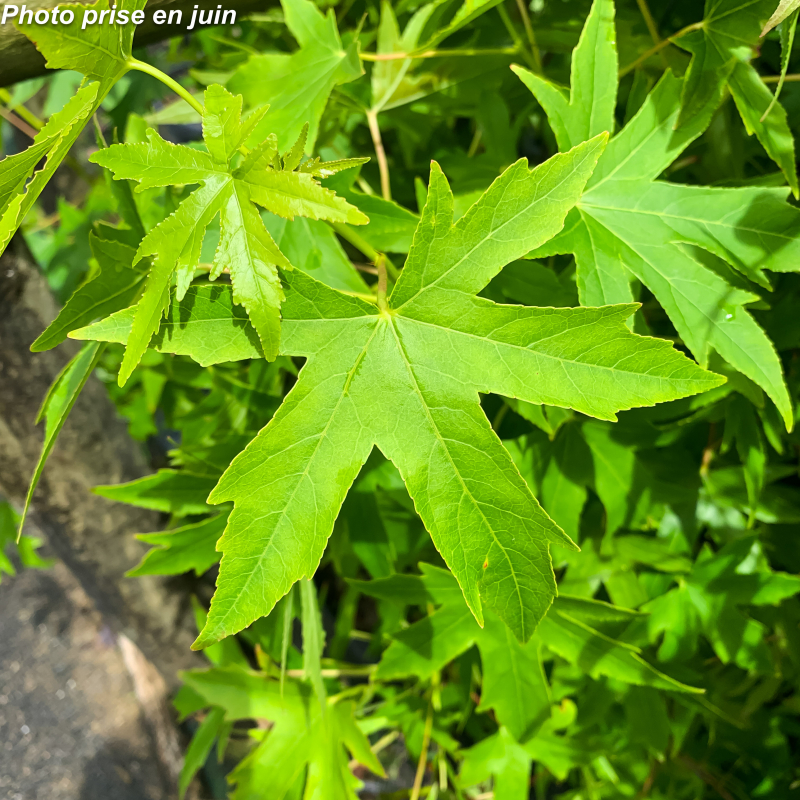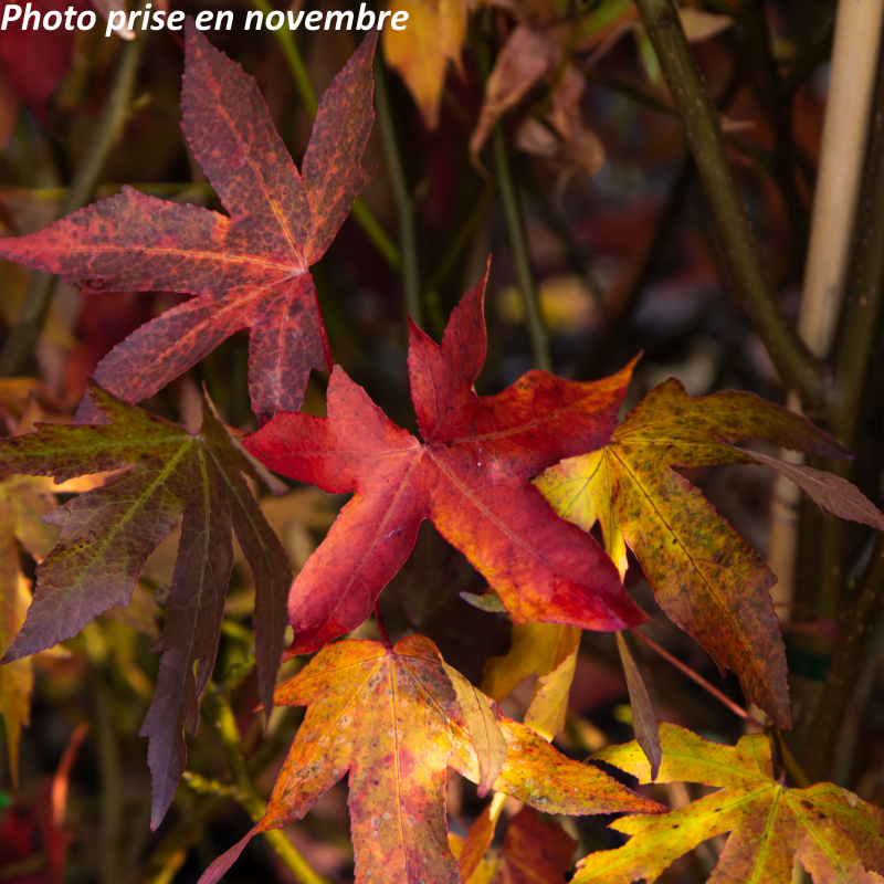 Arbre caduc de taille moyenne au feuillage palmé vert brillant plus découpé que chez le liquidambar styraciflua, aux couleurs flamboyantes en automne, rouge orangé et jaune. Ecorce liègeuse sur le tronc, très décorative en hiver. Les branches basses peuvent être conservées ou coupées pour libérer le tronc. Fleurs insignifiantes en mai suivies de capsules rondes hérissées persistant en hiver. Soleil ou mi-ombre. Sol ordinaire à frais. Port pyramidal s'arrondissant avec l'âge : 10 m x 4 m en 20 ans. Rusticité: - 15°C.