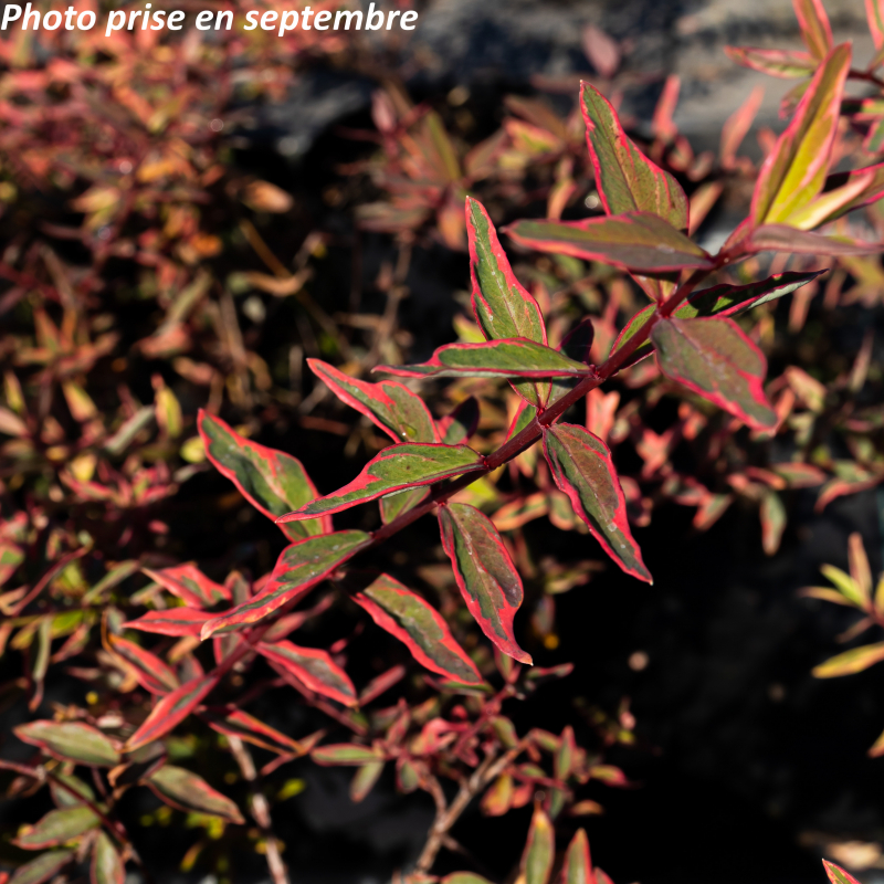 L’Hypericum x moserianum 'Tricolor', aussi appelé millepertuis arbustif ou millepertuis tricolore, est un petit arbuste rampant. Sa belle floraison attire les regards en été en contrastant avec son feuillage semi-persistant panaché et ses tiges teintées de rouge. Rustique et résistante à la sécheresse, cette plante tout terrain se cultive en pot, dans un bac ou en pleine terre.