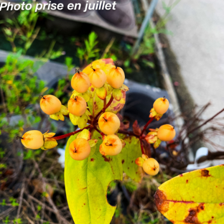 Arbuste au port assez compact et bien ramifié et au feuillage semi-persistant, vert assez foncé, particulièrement résistant aux attaques de rouille. Abondance de petites fleurs jaunes à grandes étamines. Floraison de juin à septembre. Apparition de fruits décoratifs couleur rose clair. Bouquets de fruits rosé et de forme ovale qui apportent aux arbustes un intérêt décoratif jusque fin septembre. Exposition : soleil, mi-ombre. Sol léger, pauvre, même calcaire. Port buissonnant : 0,90 x 0,60 m. Rusticité : -15°C