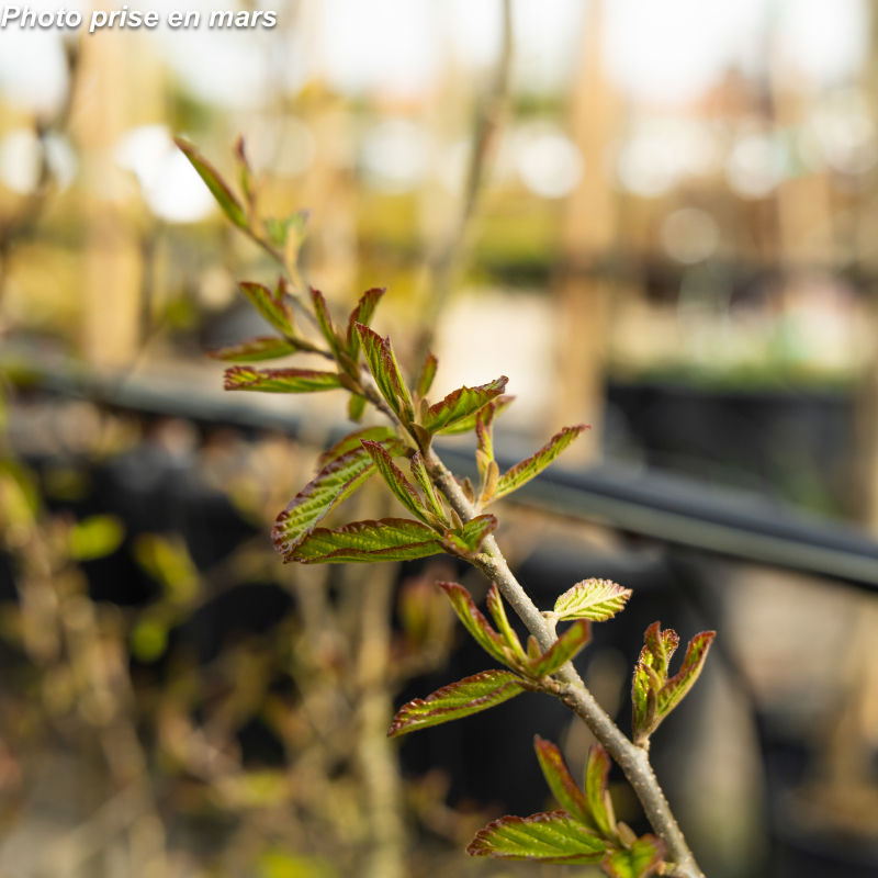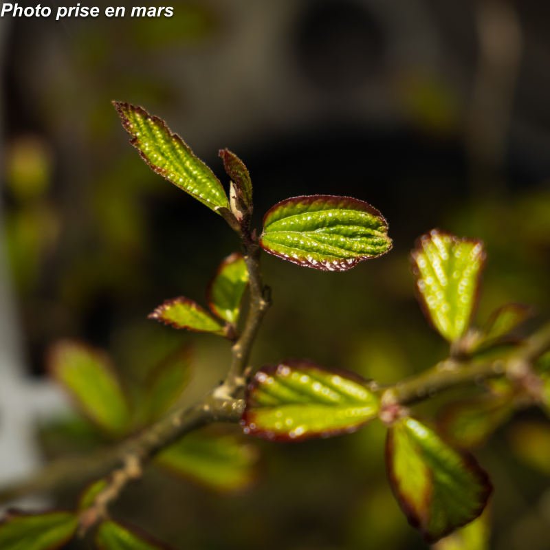 Petit arbre caduc aux jeunes feuilles vertes bordées de pourpre passant au vert foncé en été puis prenant des couleurs éclatantes en automne rouge orange rose. Petite floraison rouge bien visible de mi-Janvier à Mars.