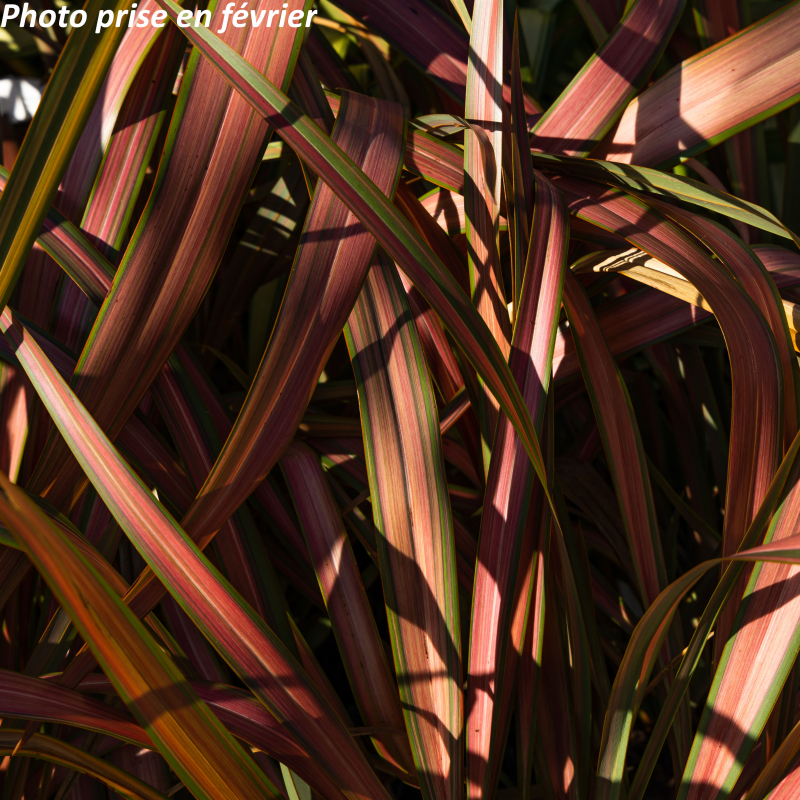 Le feuillage du Phormium Tenax peut virer du vert au rayé ou au pourpre selon les variétés.