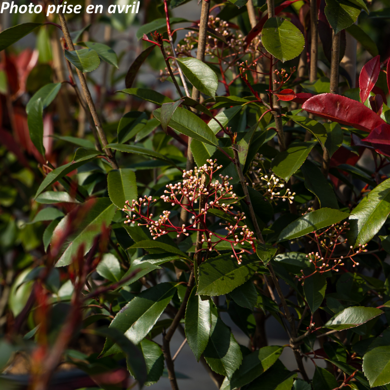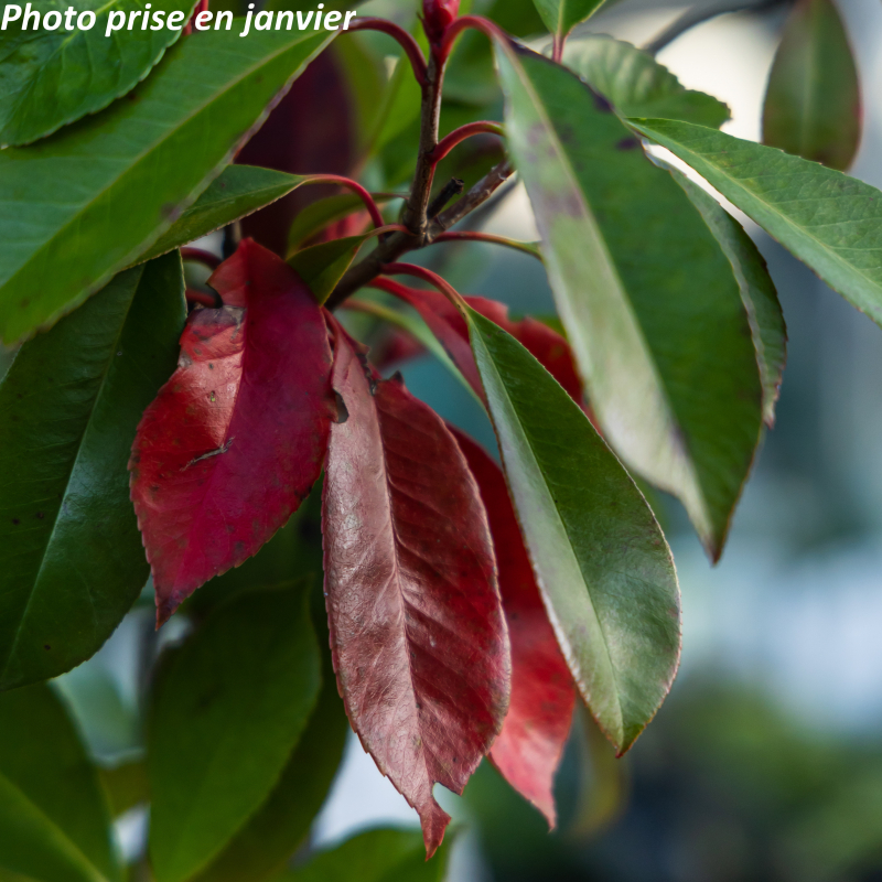 De la couleur dans votre haie ! Arbuste persistant vert brillant aux feuilles oblongues dépassant 10 cm. Les jeunes feuilles sont rouges au printemps et en fin d'été avec une floraison blanche en avril-mai. Soleil. Sol ordinaire pas trop sec ni trop humide. Port vertical touffu: 3 m x 2 m. Rusticité: -15°C.