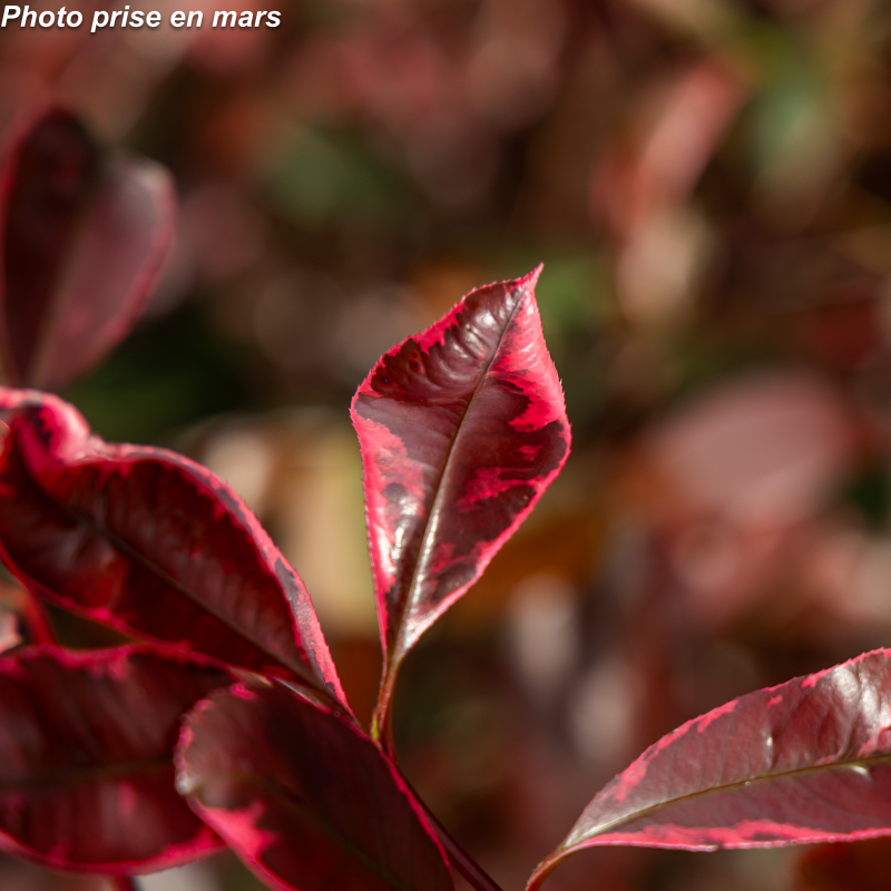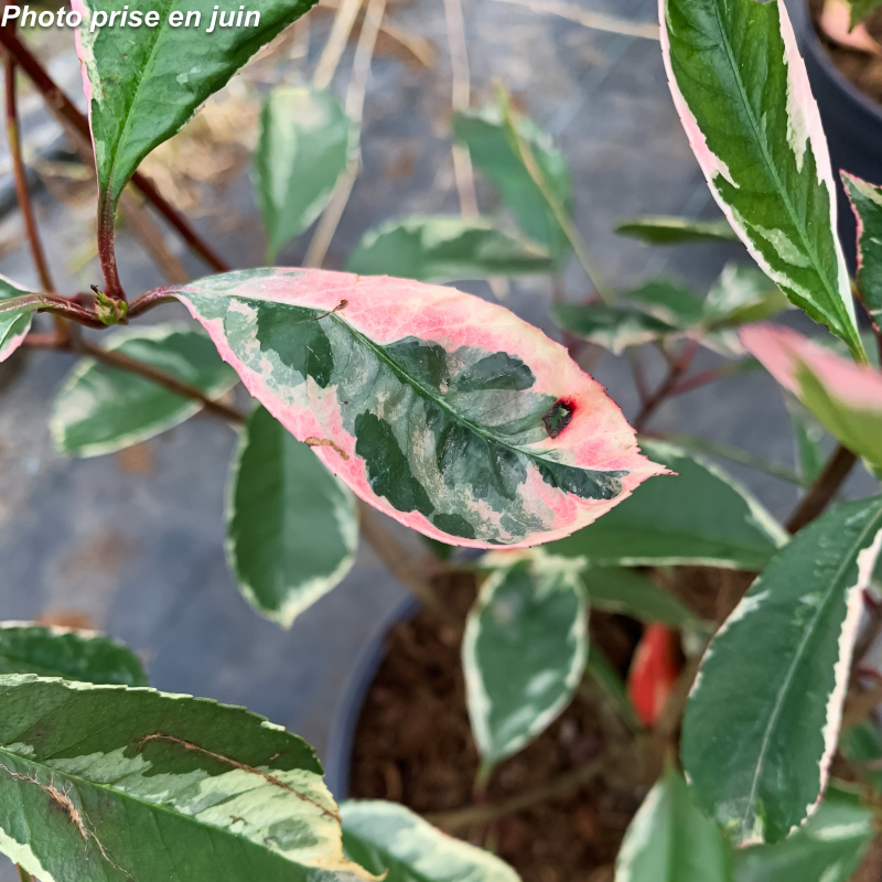 De la couleur dans votre haie ! Arbuste persistant vert foncé taché de blanc brillant aux feuilles oblongues dépassant 10 cm. Les jeunes feuilles sont rouges au printemps et en fin d'été avec une floraison parfumée blanche en mai-juin. Soleil. Sol ordinaire pas trop sec ni trop humide. Port vertical touffu: 3 m x 2 m. Rusticité: -15°C.