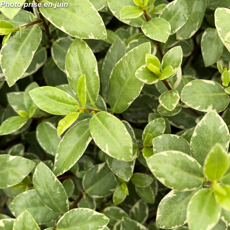 Arbuste persistant dense, aux petites feuilles au bord ondulé, vert gris marginé de blanc. Rameaux fins et foncés. Fleurs noires insignifiantes au printemps. Soleil ou mi-ombre. Sol ordinaire plutôt sec ou bien drainé. Port compact: 0. 80 m x 0. 80 m. Rusticité: - 9°C.