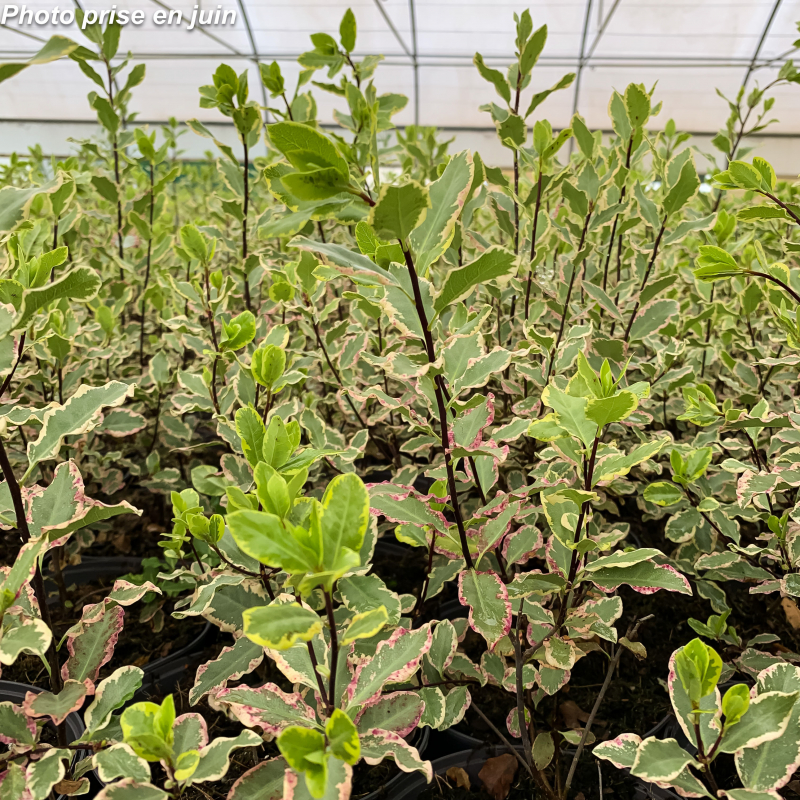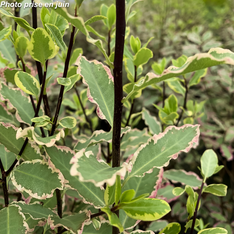 Petit arbuste au port buissonnant arrondi remarquable pour son feuillage persistant d'un vert gris marginé de blanc rosé, ses rameaux noirs et ses fleurs en étoiles d'un violet presque noir au parfum de miel. Floraison : avril-mai. Exposition : soleil, mi-ombre. Tout type de sol, même calcaire, sain, drainé, pas trop sec à frais. Résistant aux embruns. Port arrondi :2x 1,50 m. Rusticité : - 10°C