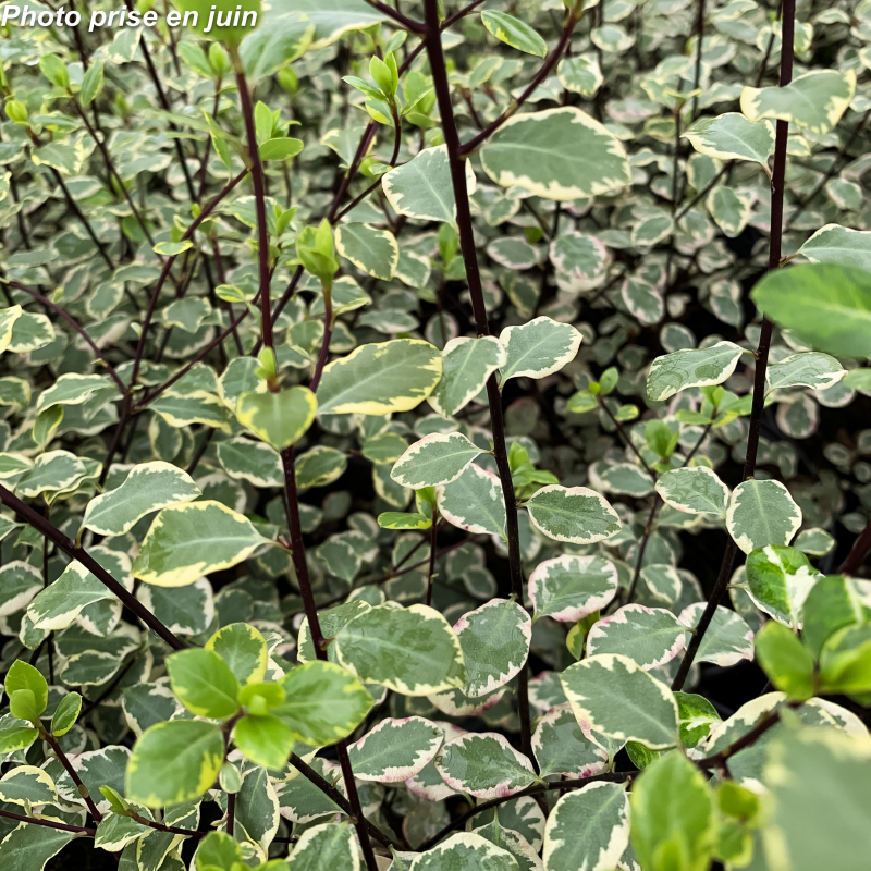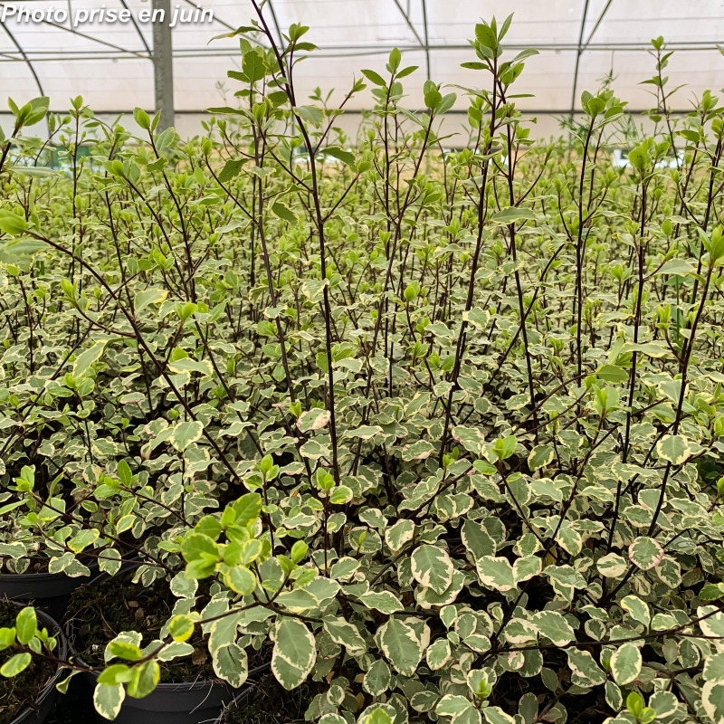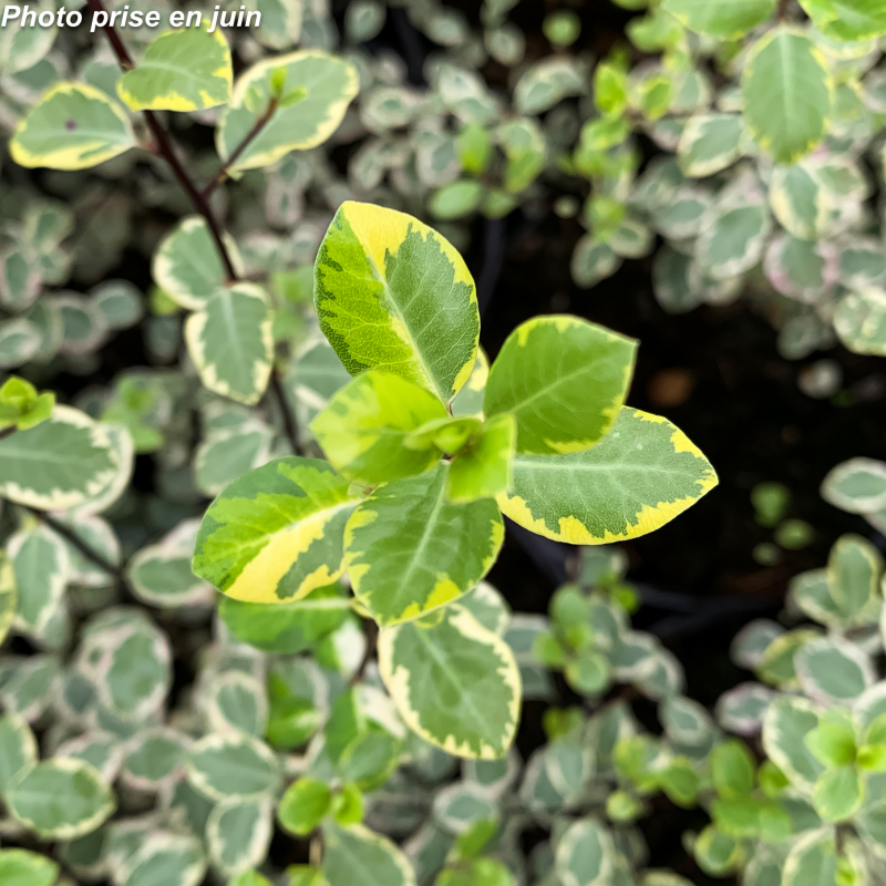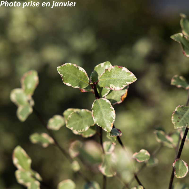 Arbuste à la végétation dense et compacte. Ses petites feuilles sont d'un superbe vert grisâtre marginé de blanc crème. Sous l'action de la fraîcheur, son feuillage panaché se teinte de rose durant l'hiver. Ses fins rameaux noirs sont très décoratifs. En mai-juin, ses fleurs pourpres répandent un très agréable parfum de miel. Exposition : soleil, mi-ombre. Tout type de sol, même calcaire, sain, drainé, pas trop sec à frais. Port arrondi : 2 x 1,50 m. Rusticité : - 8°C