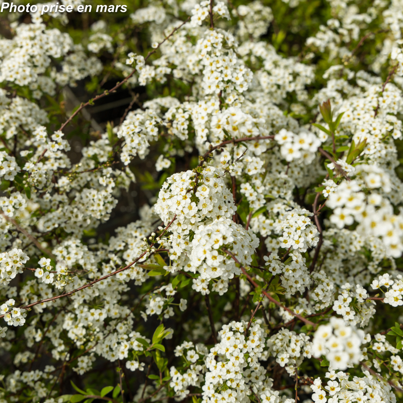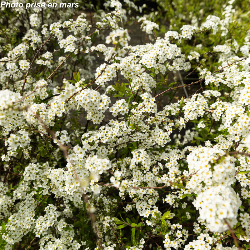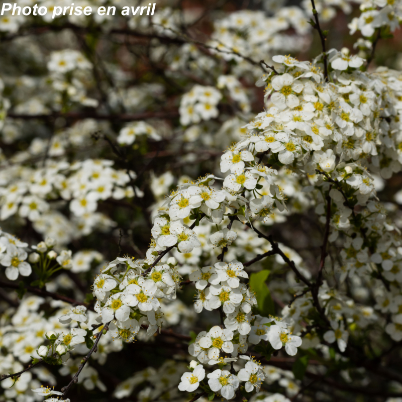 Arbuste caduc aux branches verticales vert-poupré, au feuillage vert clair, aux fleurs en épis blancs retombants en avril-mai. Soleil ou mi-ombre. Sol ordinaire sec ou frais. Port compact et retombant: 2,50 m x 2,50 m. Rusticité: -20°C