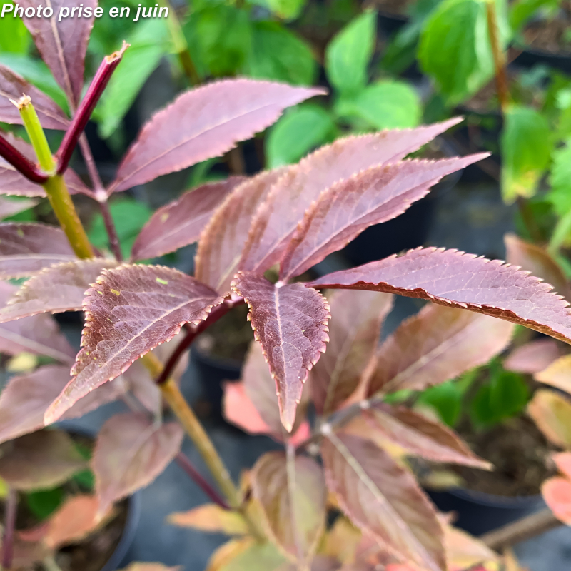 Arbuste à écorce rougeâtre. Feuilles caduques vertes virant au pourpre foncé en automne. Panicules de fleurs mellifères rosées et parfumées (propriétés médicinales). Fruits globuleux rouges puis noirs, avec lesquels on fait des sirops et des confitures. Attention, il ne faut pas les manger crus, ils sont légèrement toxiques et provoquent des vomissements. Cette toxicité disparaît avec la cuisson. Floraison: juin. soleil ou mi-ombre. Sol ordinaire, pas trop sec à frais. Port large: 3x 3 m. Rusticité : - 15°C