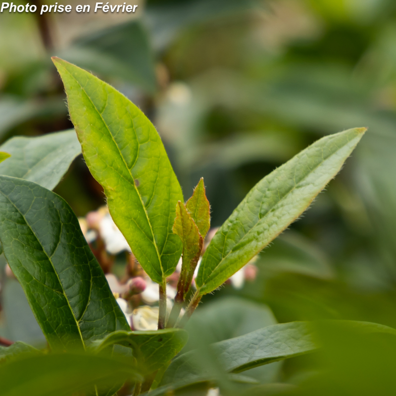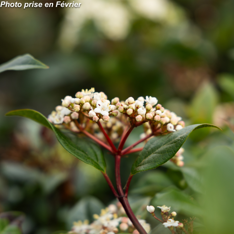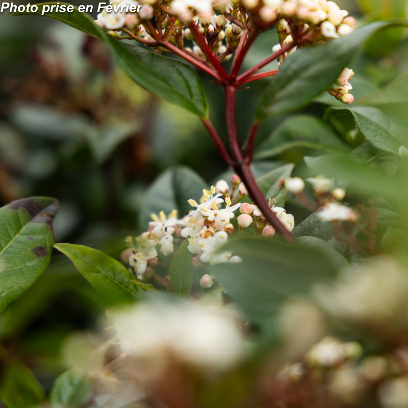 Arbuste persistant au feuillage vert brillant et aux rameaux pourprées ce qui fait l'originalité de cette variété. Les fleurs qui se succèdent de l'automne au pintemps sont roses en boutons pour d'épanouir blanches en suite. Sol sain à sec. Soleil ou mi-ombre. Port érigé compact: 2 m x 1,50m. Rusticité : - 15°C.