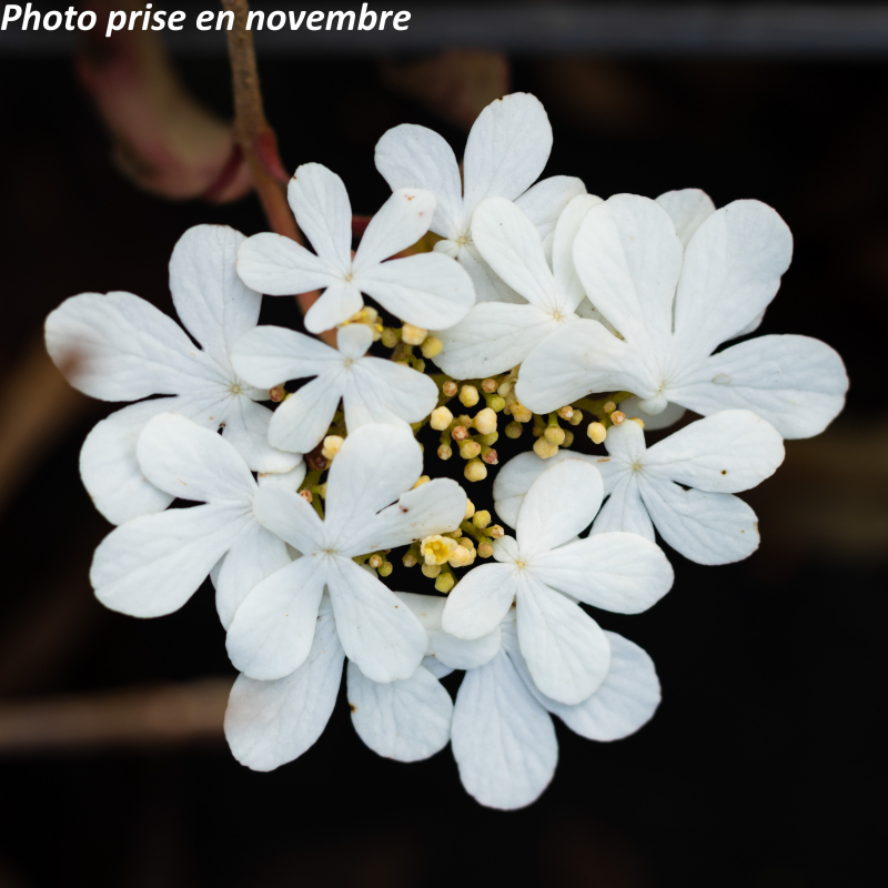 Arbuste caduc au feuillage vert mat devenant rouge en automne. Variété naine. Les cymes plates blanches en mai-juin semblent posées à plat sur les rameaux étagés. Sol sain riche. Soleil ou mi-ombre. Port érigé: 1. 80 m x 1 m. Rusticité: -15°C