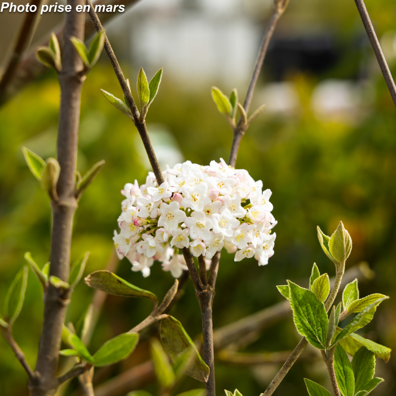 Arbuste persistant à semi persistant. Feuilles ovales vert foncé, luisantes parfois rougissant pourpre en hiver. Soleil ou mi ombre. Sol ordinaire riche, frais, en situation abritée du vent. Boutons rosés, fleurs blanches, très parfumées, en corymbes denses, en avril-mai. Port buissonnant: 2, 50 m x 1. 50 m. Rusticité -15 °C. Nom commun: Viorne.