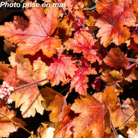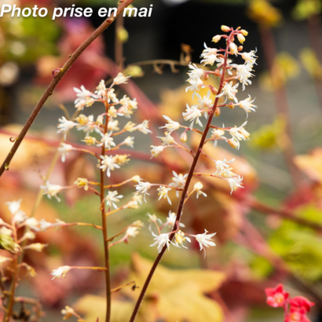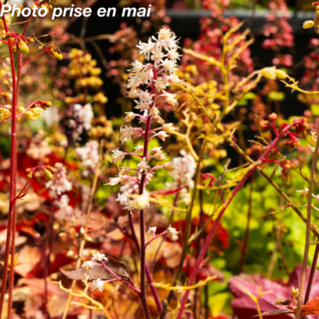 Vivace persistante à feuillage découpé vert acide et au centre cramoisi foncé. Fleurs blanches de mai à août sur une tige de 0.50 m. Ombre ou mi-ombre. Sol sain à frais. Rusticité : - 15°.