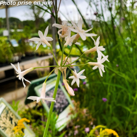 Vivace bulbeuse caduque. au feuillage fin. vert strié crème. Floraison de couleur blanc. formant de grandes ombelles érigées de juillet à octobre. au parfum d'ail.