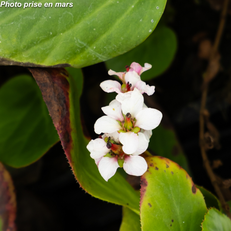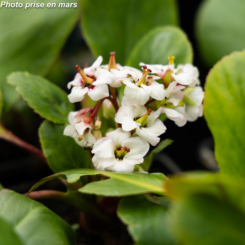 Vivace aux grandes feuilles robustes. persistantes. vert brillant. Fleurs blanches en bouquets au bout de hautes tiges rouges. Abondante floraison en mai-juin. Exposition : soleil ou mi-ombre. Sol ordinaire. sain. drainé. pas trop sec à frais. Port compact : 0.30 m x 0.50 m. Rusticité : - 15°C