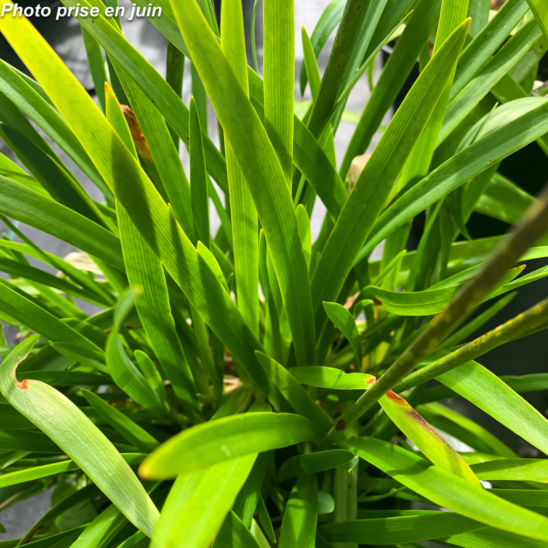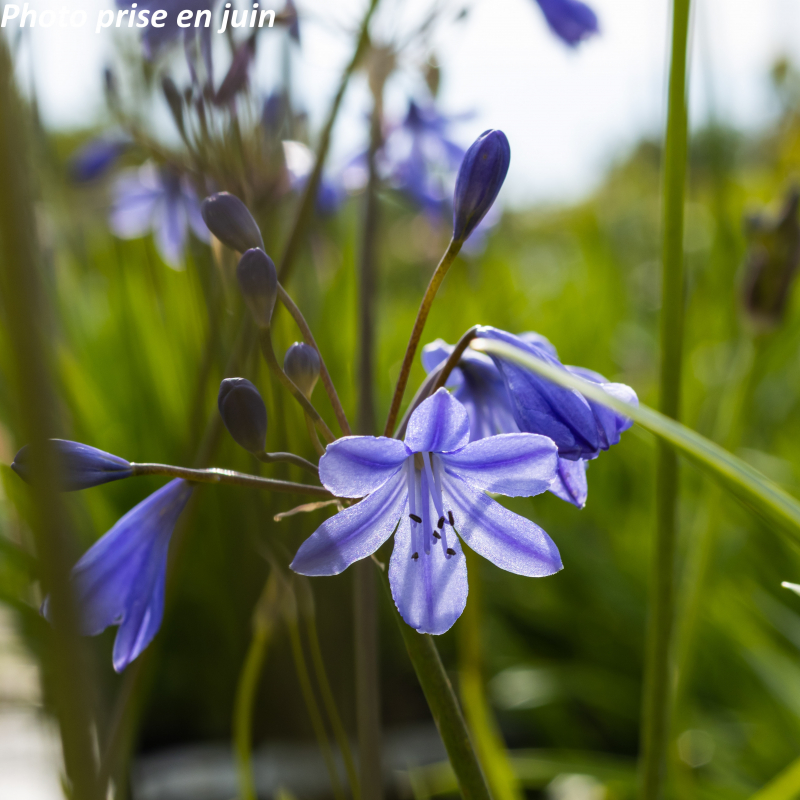 Vivace au feuillage persistant long vert. Longue floraison de juin à septembre. Grandes ombelles de fleurs en trompette d'un bleu clair.