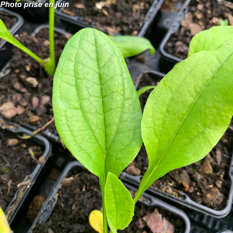 Vivace caduque au feuillage vert foncé raide et rugueux. aux tiges raides et solides. aux fleurs en marguerite assez grandes de 8 à 10 cm blanc avec un coeur brun-orangé de juillet à septembre.