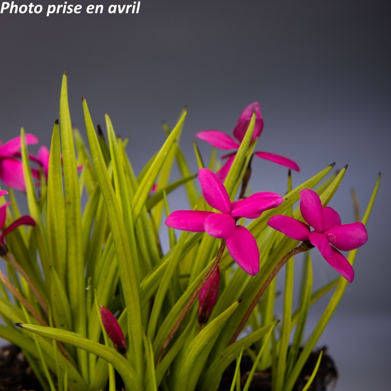 Vivace caduque. bulbeuse au feuillage étroit vert et une floraison rose soutenu de Juin à Août. Soleil. mi-ombre. Sol humifère. drainant en hiver. frais en été. Attention à l'excès d'eau l'hiver pour les plants en pleine terre.Mieux vaut les planter en pot pour les hiverner facilement et les isoler du gel et de l'humidité.0.10 m x 0.50 mRusticité : -7°C