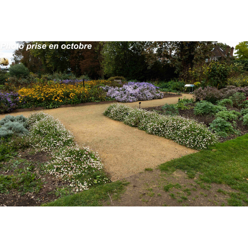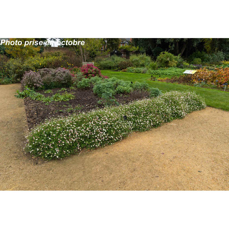 Vivace au feuillage fin vert caduc. rampant. Floraison caractéristique ressemblant à la pâquerette. blanche ou rose au coeur jaune de mai à septembre. Très florifère. Croissance rapide.