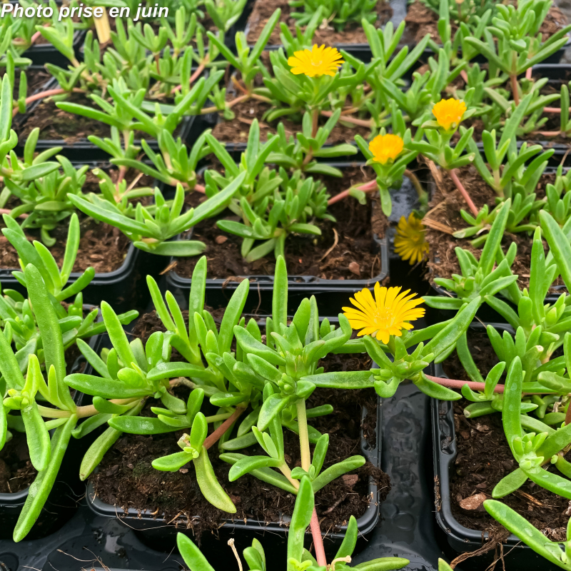 Le Delosperma ‘Wheels of Wonder Golden’ est une des six variétés de la série Wheels of Wonder. Ce cultivar offre une floraison incroyable constituée de grandes fleurs d’un jaune d’or éclatant. Le Delosperma appelé également pourpier vivace se caractérise par des tiges rampantes s’étalant comme un tapis dense fleuri.